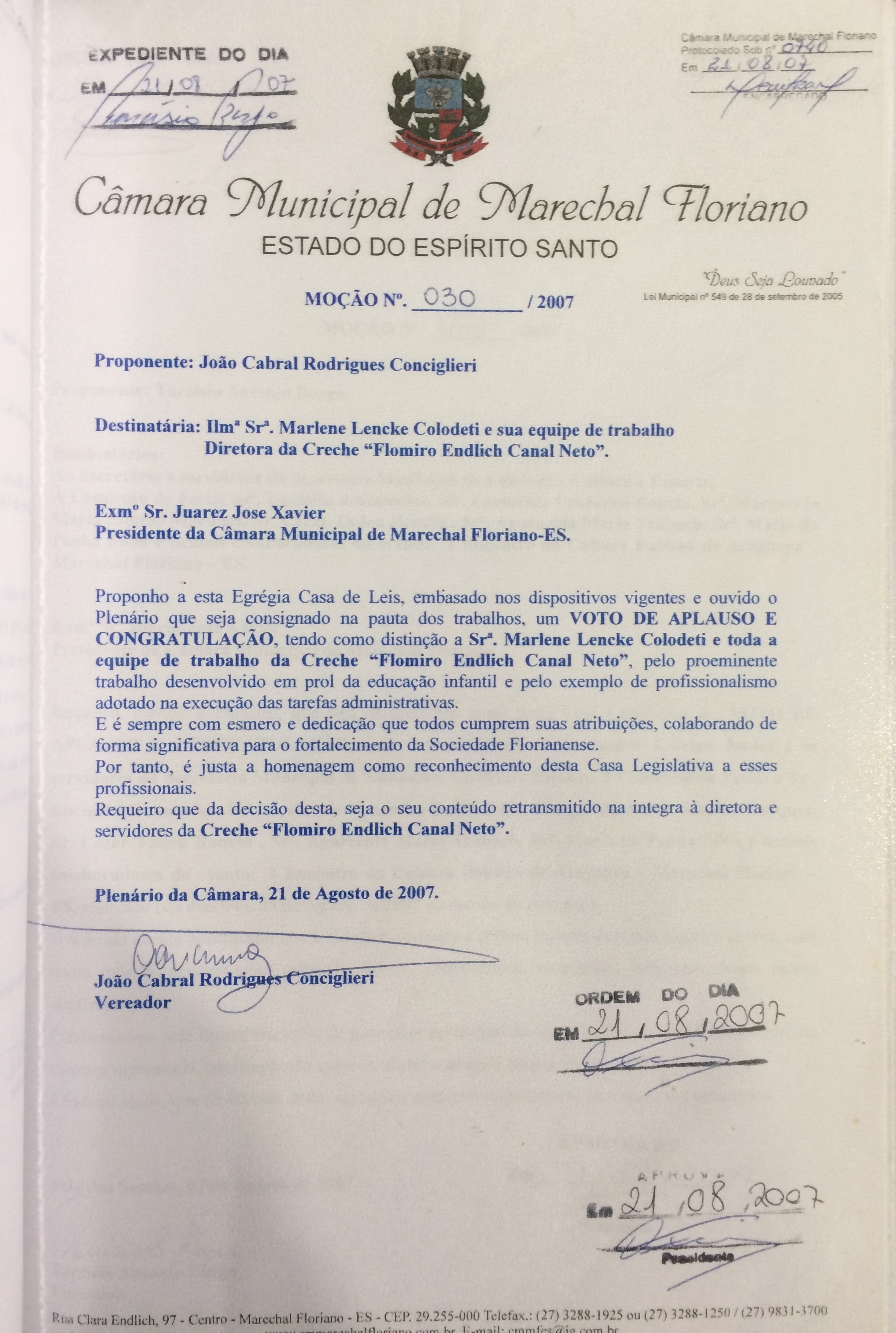 Ementa: MOÇÃO DE APLAUSO E CONGRATULAÇÃO, TENDO COMO DISTINÇÃO A SRª. MARLENE LENCKE COLODETI E A TODA A EQUIPE DE TRABALHO DA CRECHE "FLOMIRO ENDLICH CANAL NETO".