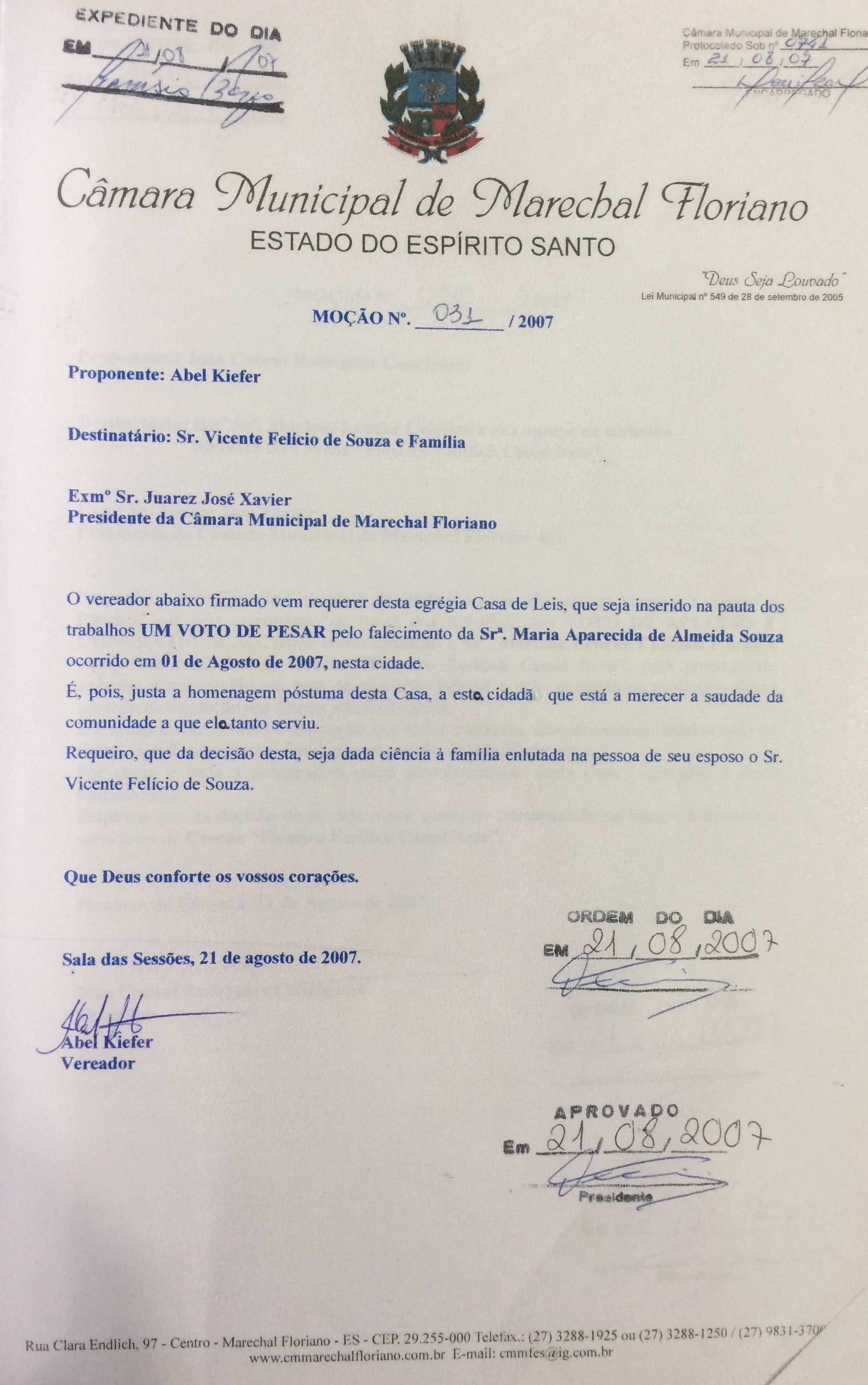 Ementa: MOÇÃO DE PESAR PELO FALECIMENTO DA SRª. MARIA APARECIDA DE ALMEIDA SOUZA OCORRIDO EM 01 DE AGOSTO DE 2007, NESTA CIDADE.