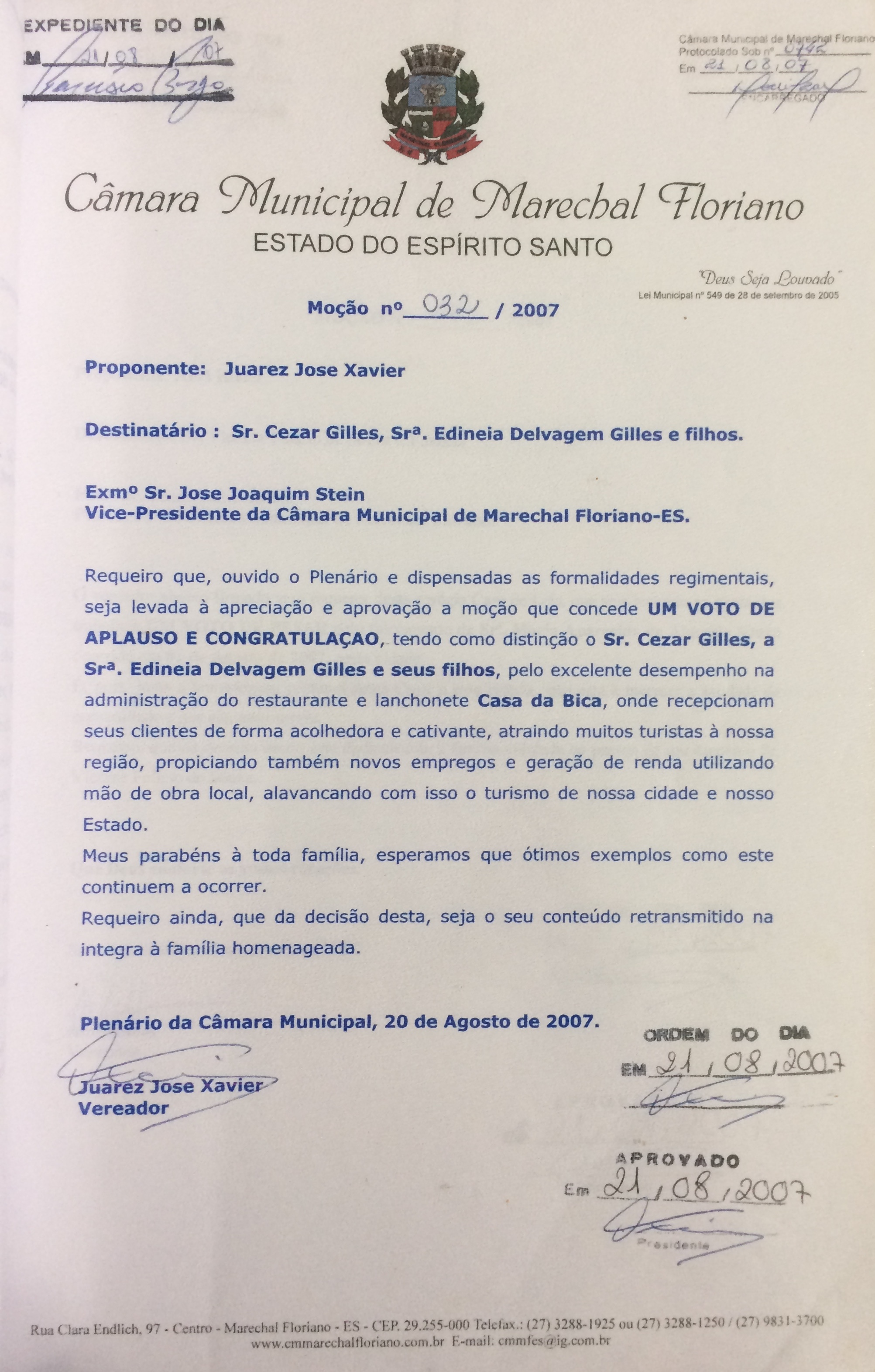 Ementa: MOÇÃO DE APLAUSO E CONGRATULAÇÃO, TENDO COMO DISTINÇÃO O SR. CEZAR GILLES, SRª. EDINEIA DELVAGEM GILLES E SEUS FILHOS.