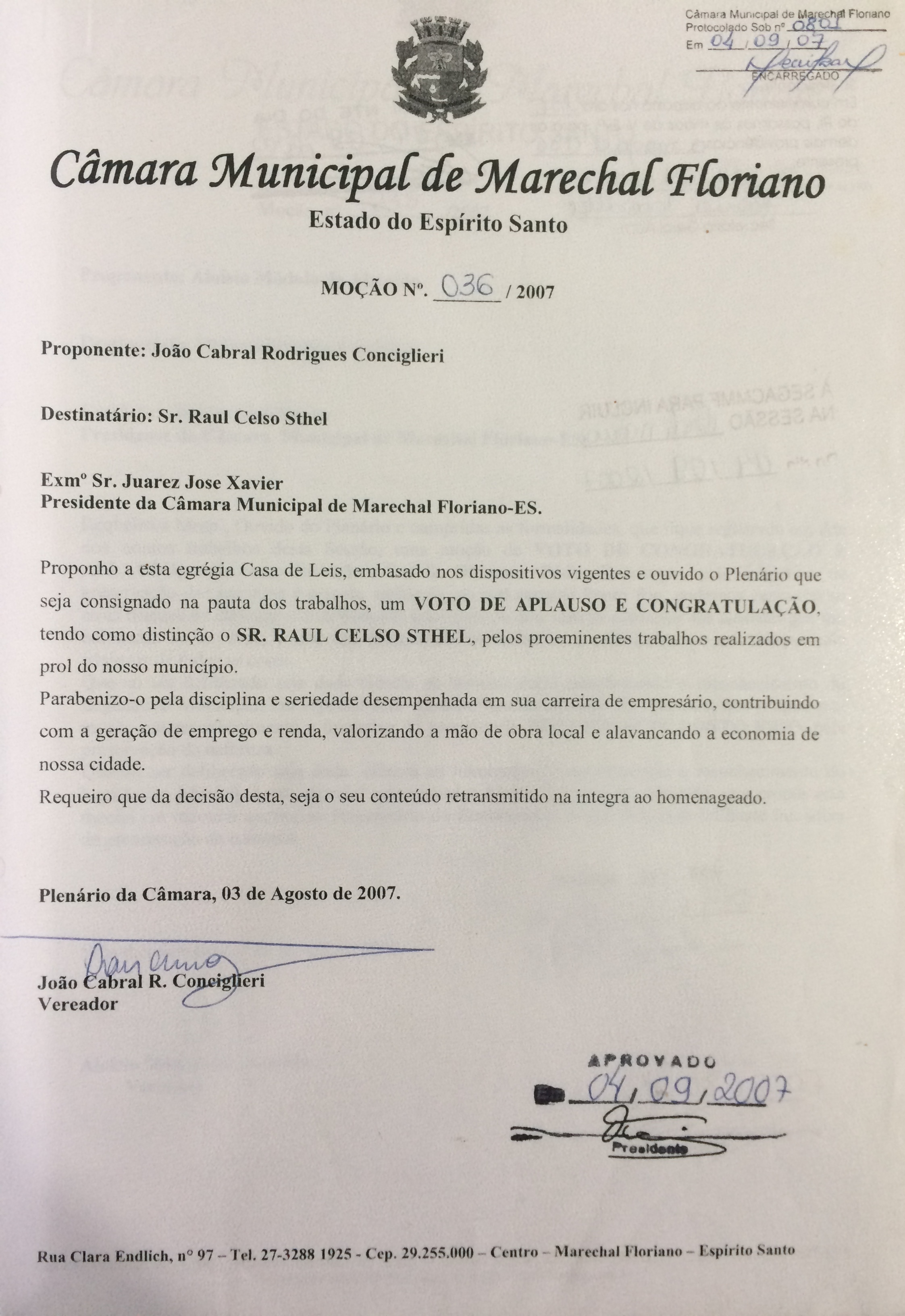 Ementa: MOÇÃO DE APLAUSO E CONGRATULAÇÃO TENDO COMO DISTINÇÃO O SR. RAUL CELSO STHEIL.