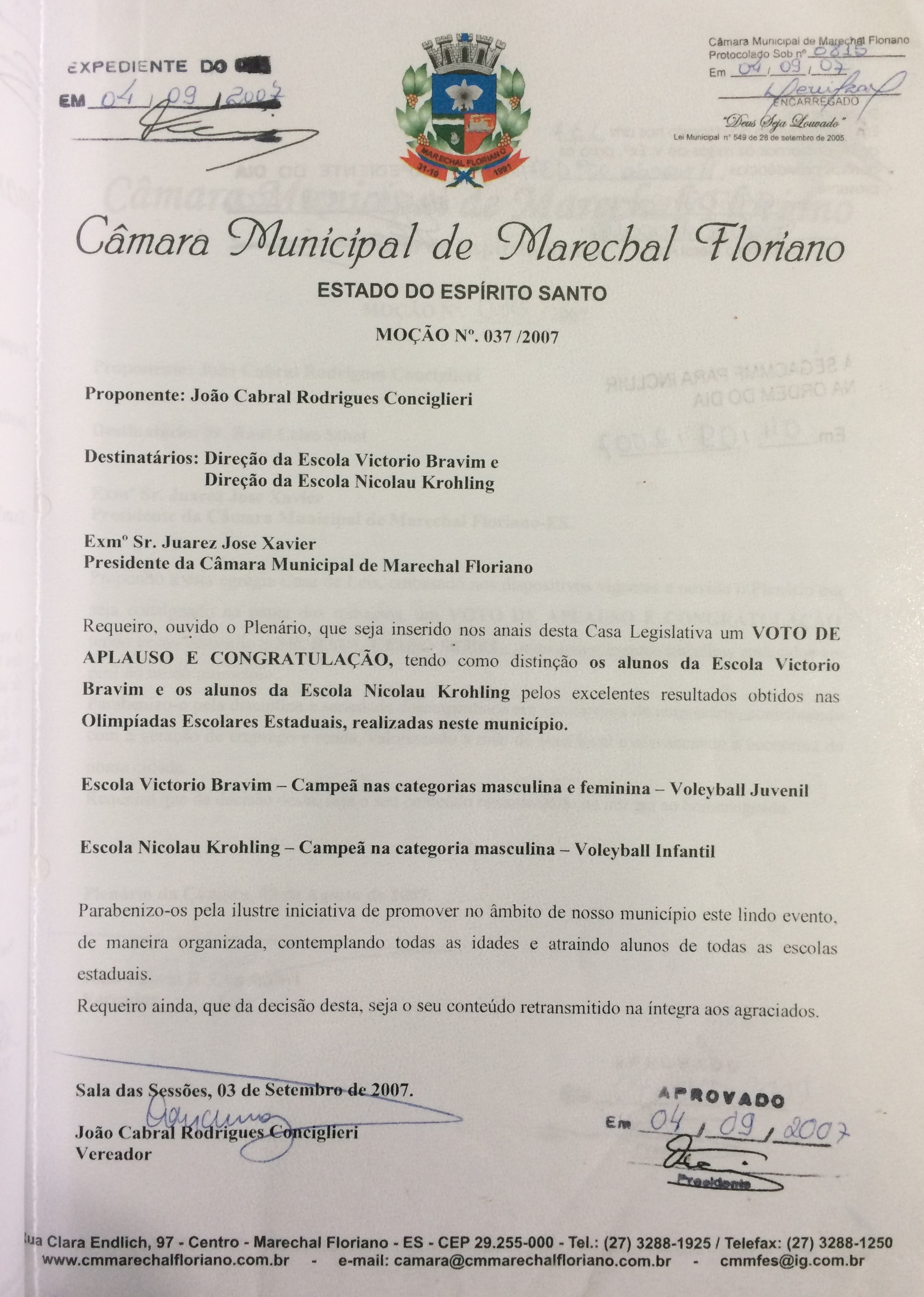 Ementa: MOÇÃO DE APLAUSO E CONGRATULAÇÃO, TENDO COMO DISTINÇÃO OS ALUNOS DA ESCOLA VICTÓRIO BRAVIM E OS ALUNOS DA ESCOLA NICOLAU KROHLING.