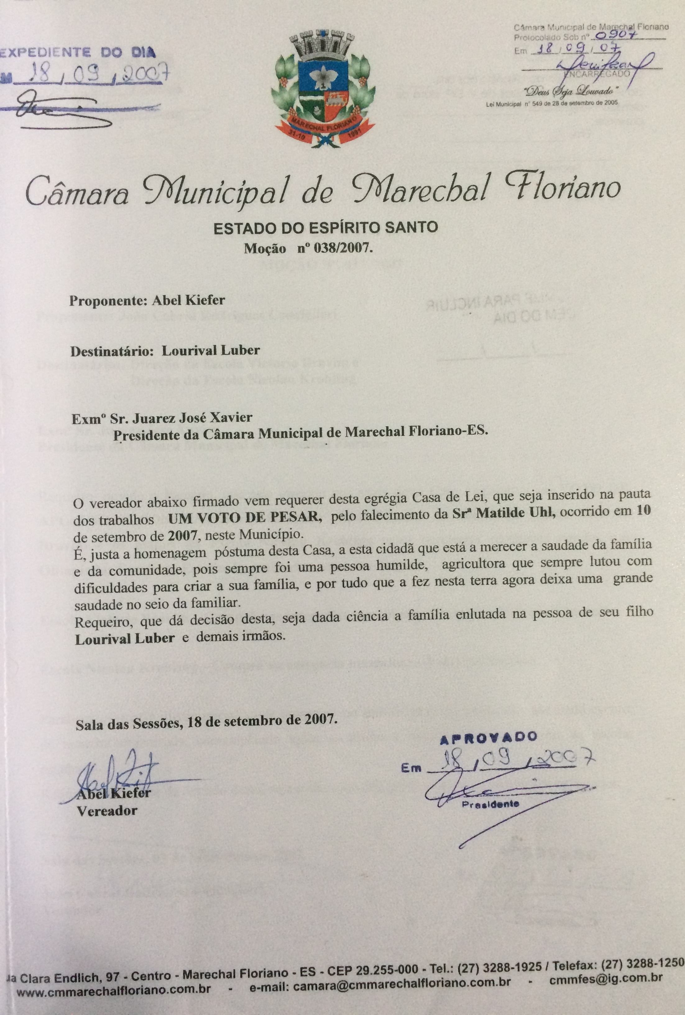 Ementa: MOÇÃO DE PESAR PELO FALECIMENTO DA SRª MATILDE UHL, OCORRIDO EM 10 DE SETEMBRO DE 2007.