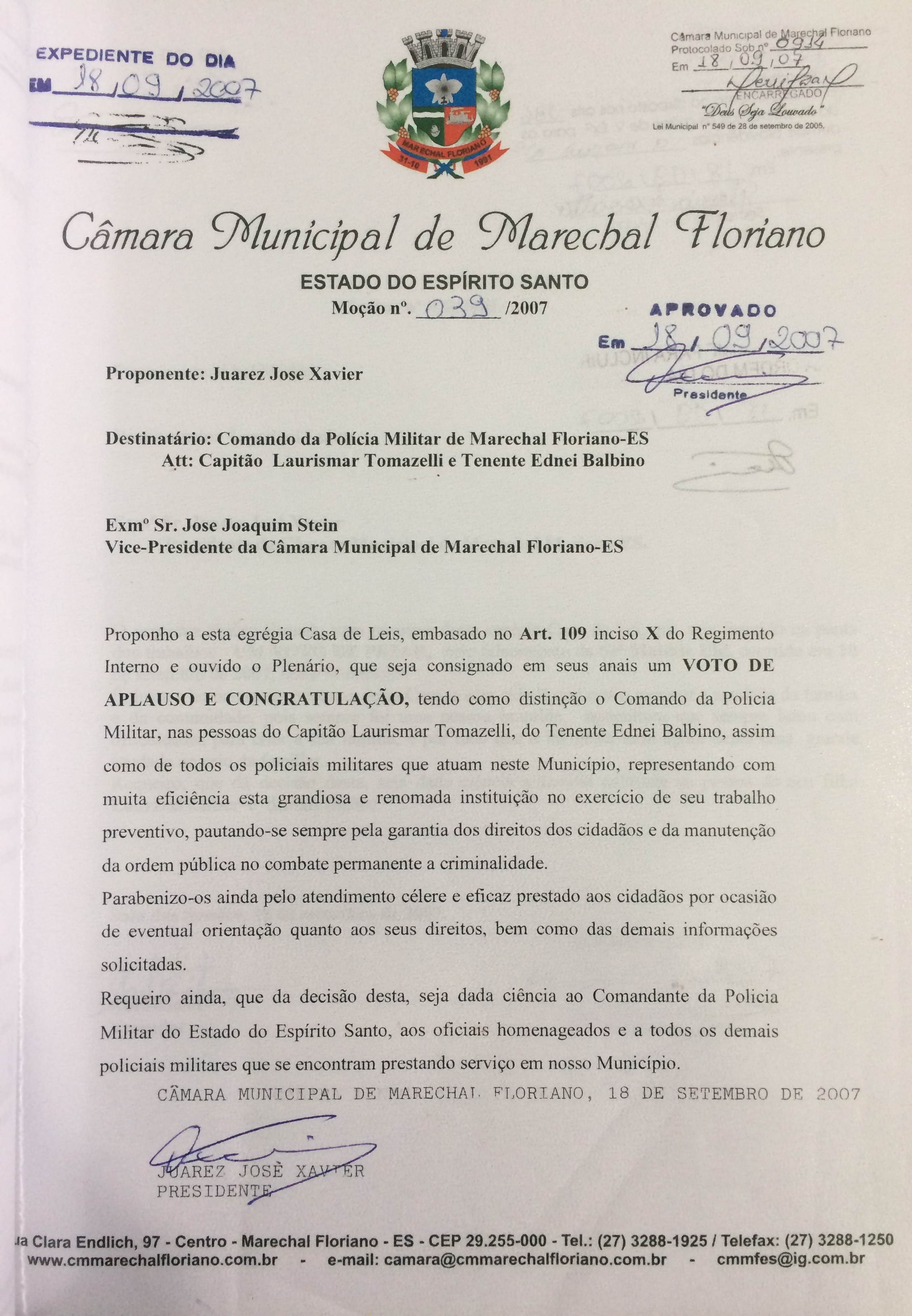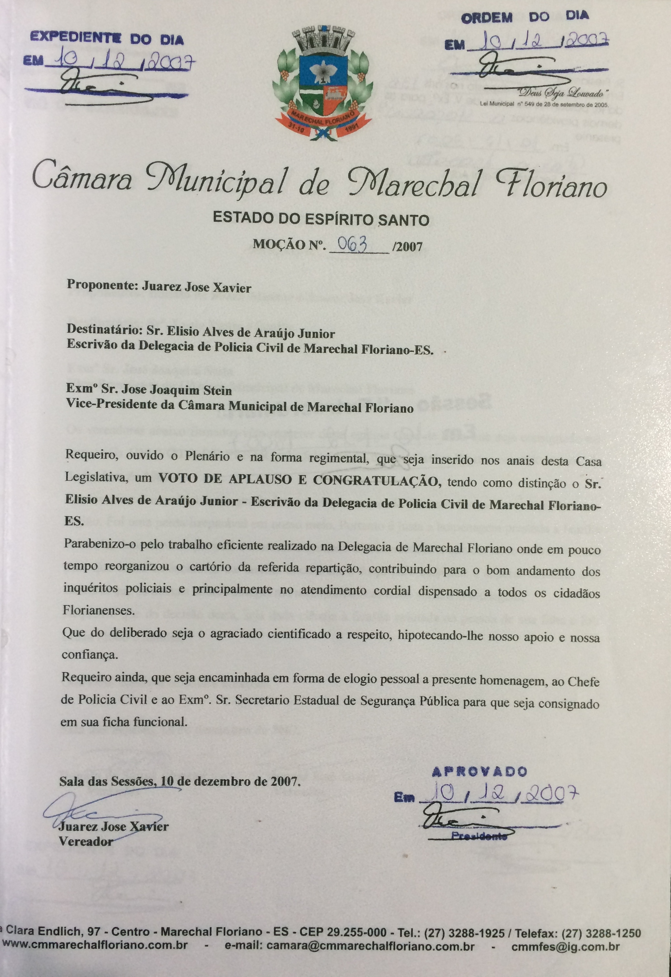 Ementa: MOÇÃO DE APLAUSO E CONGRATULAÇÃO, TENDO COMO DISTINÇÃO O SR. ELÍSIO ALVES DE ARAÚJO JUNIOR - ESCRIVÃO DA DELEGACIA DE POLICIA CIVIL DE MARECHAL FLORIANO - ES.