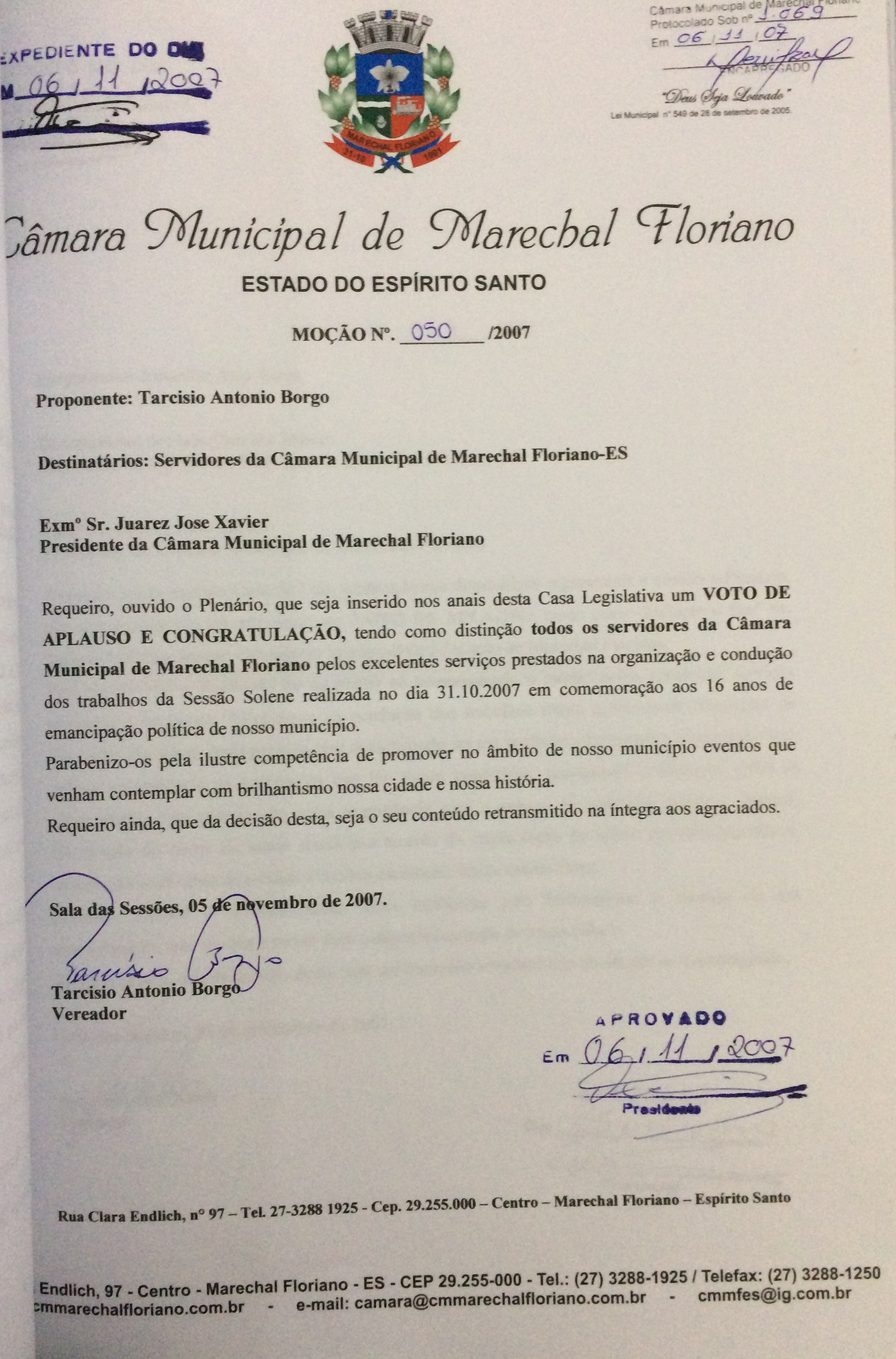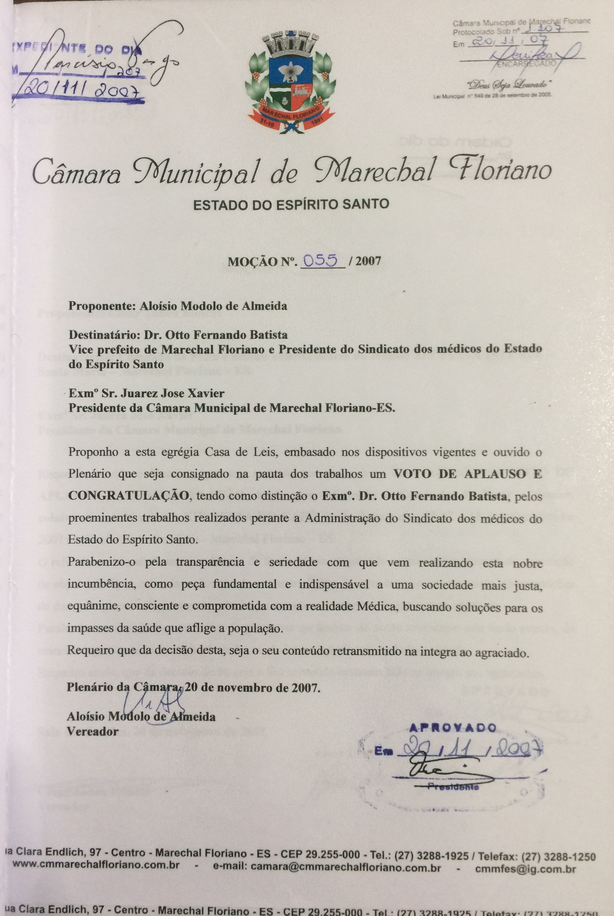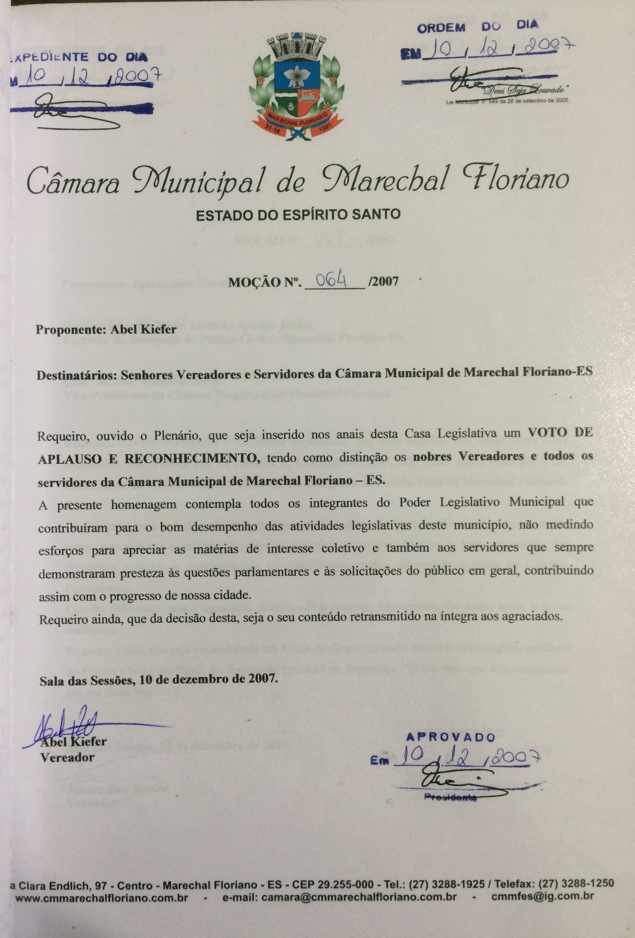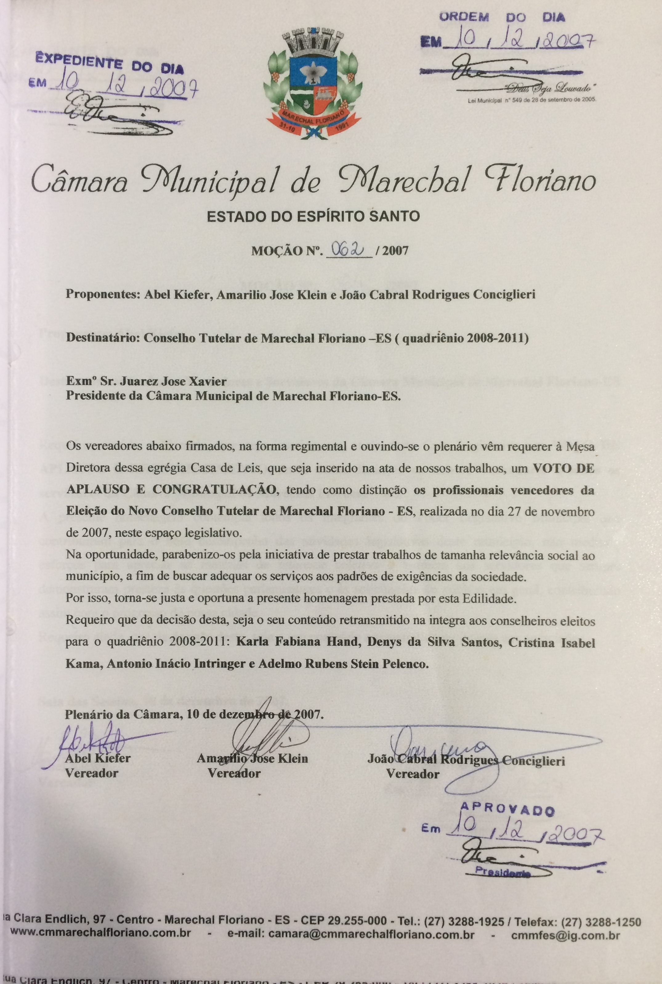 Ementa: MOÇÃO DE APLAUSO E CONGRATULAÇÃO, TENDO COMO DISTINÇÃO OS PROFISSIONAIS VENCEDORES DA ELEIÇÃO DO NOVO CONSELHO TUTELAR DE MARECHAL FLORIANO-ES, REALIZADA NO DIA 27 DE NOVEMBRO DE 2007.