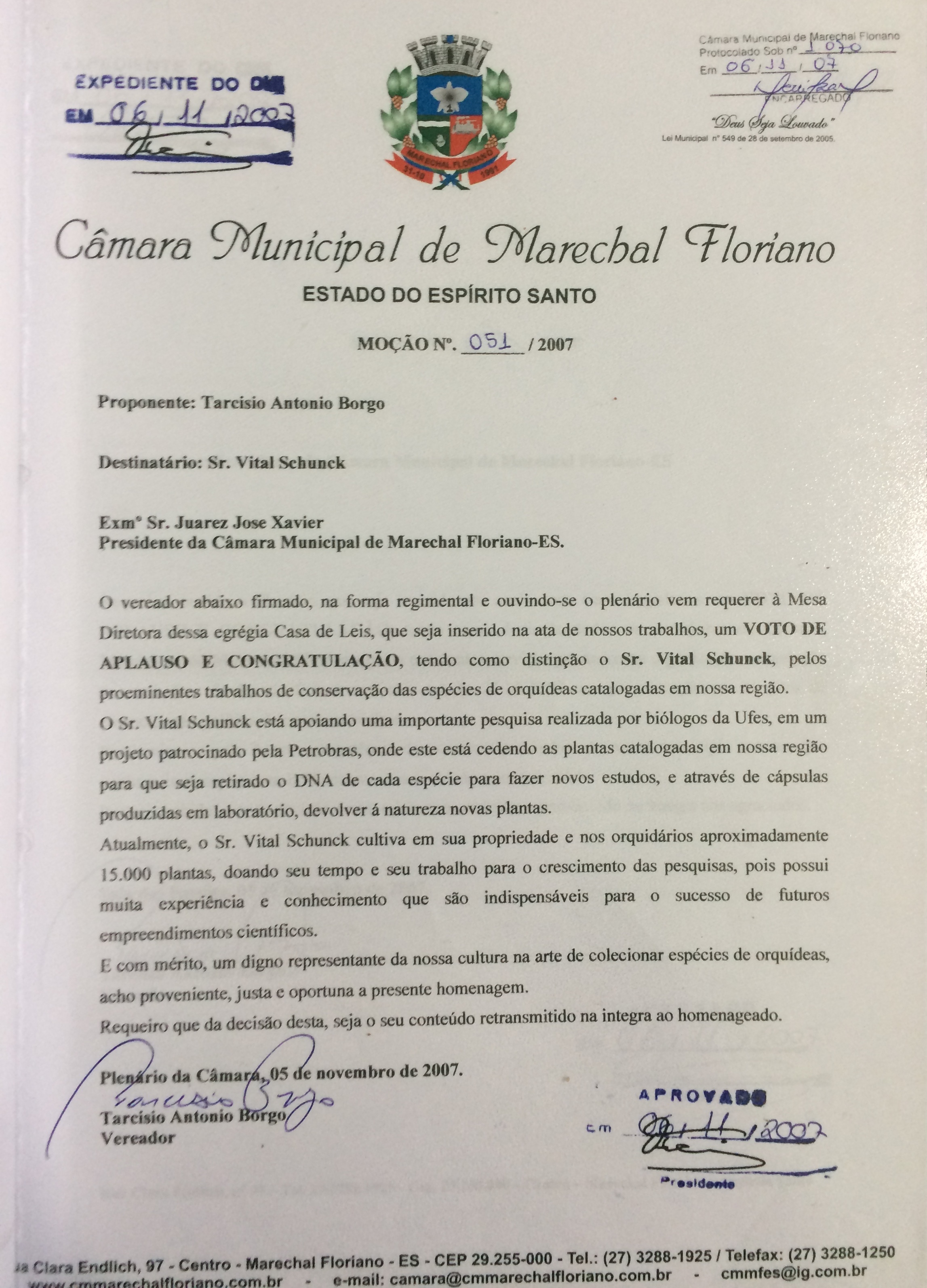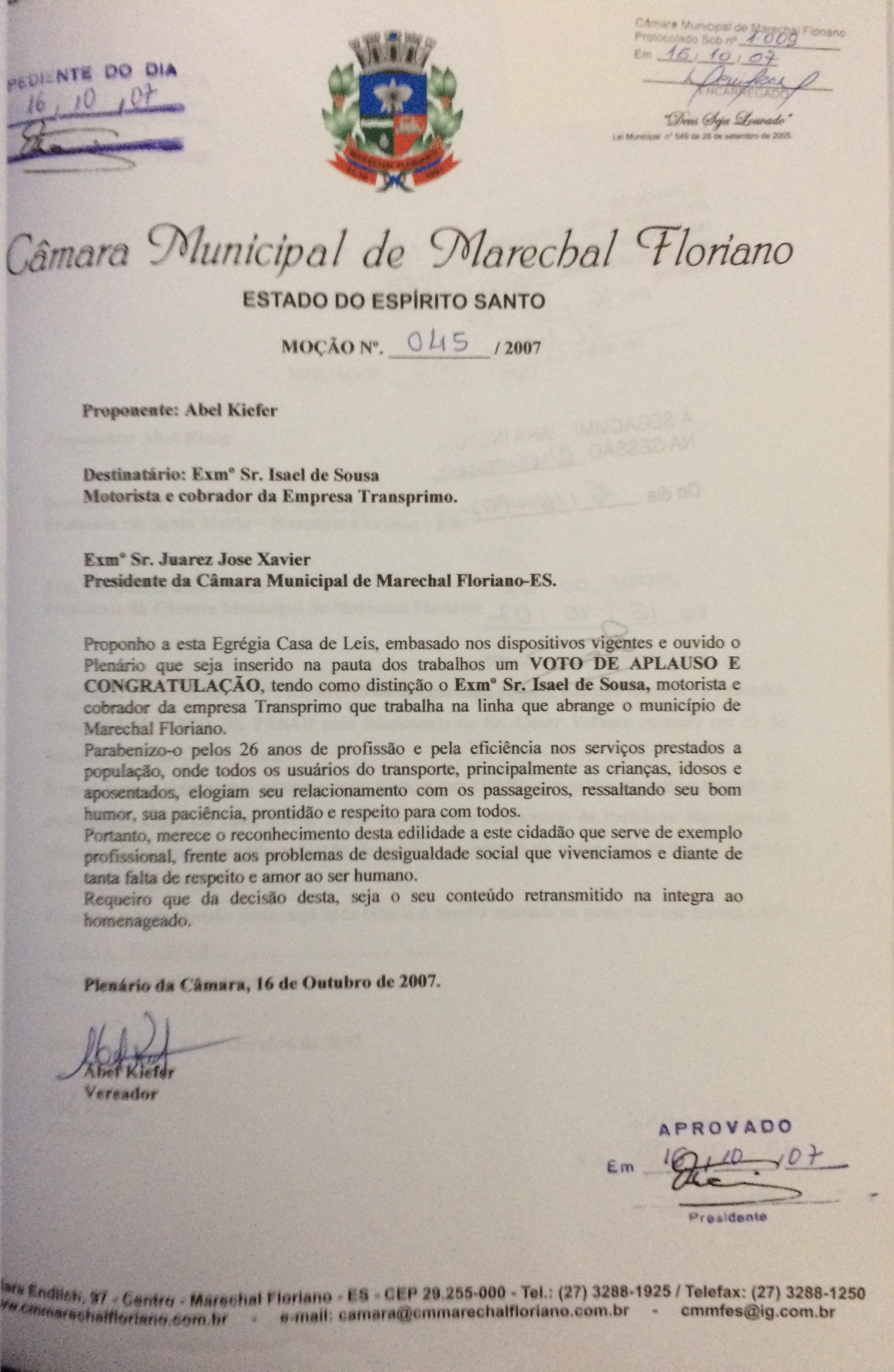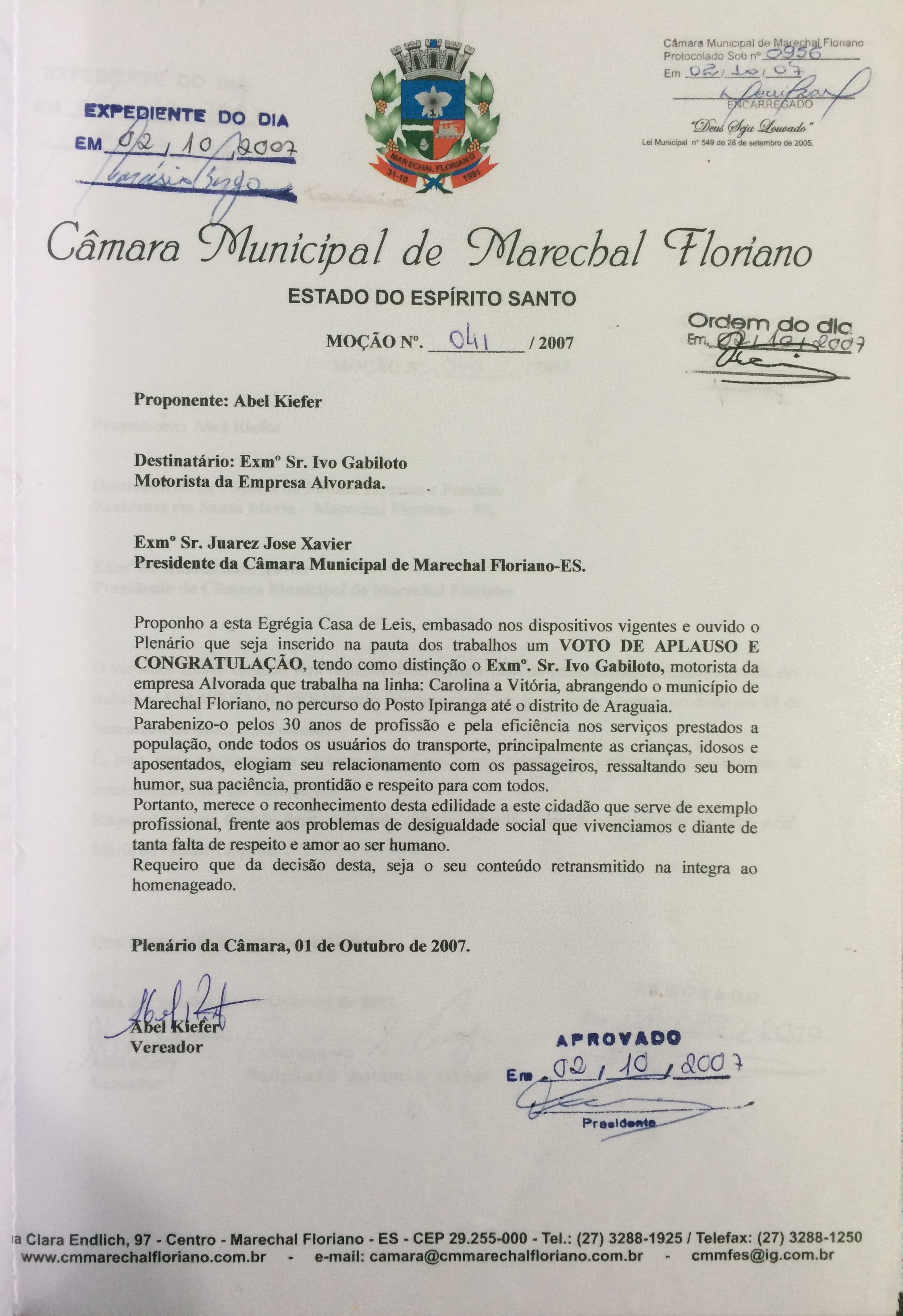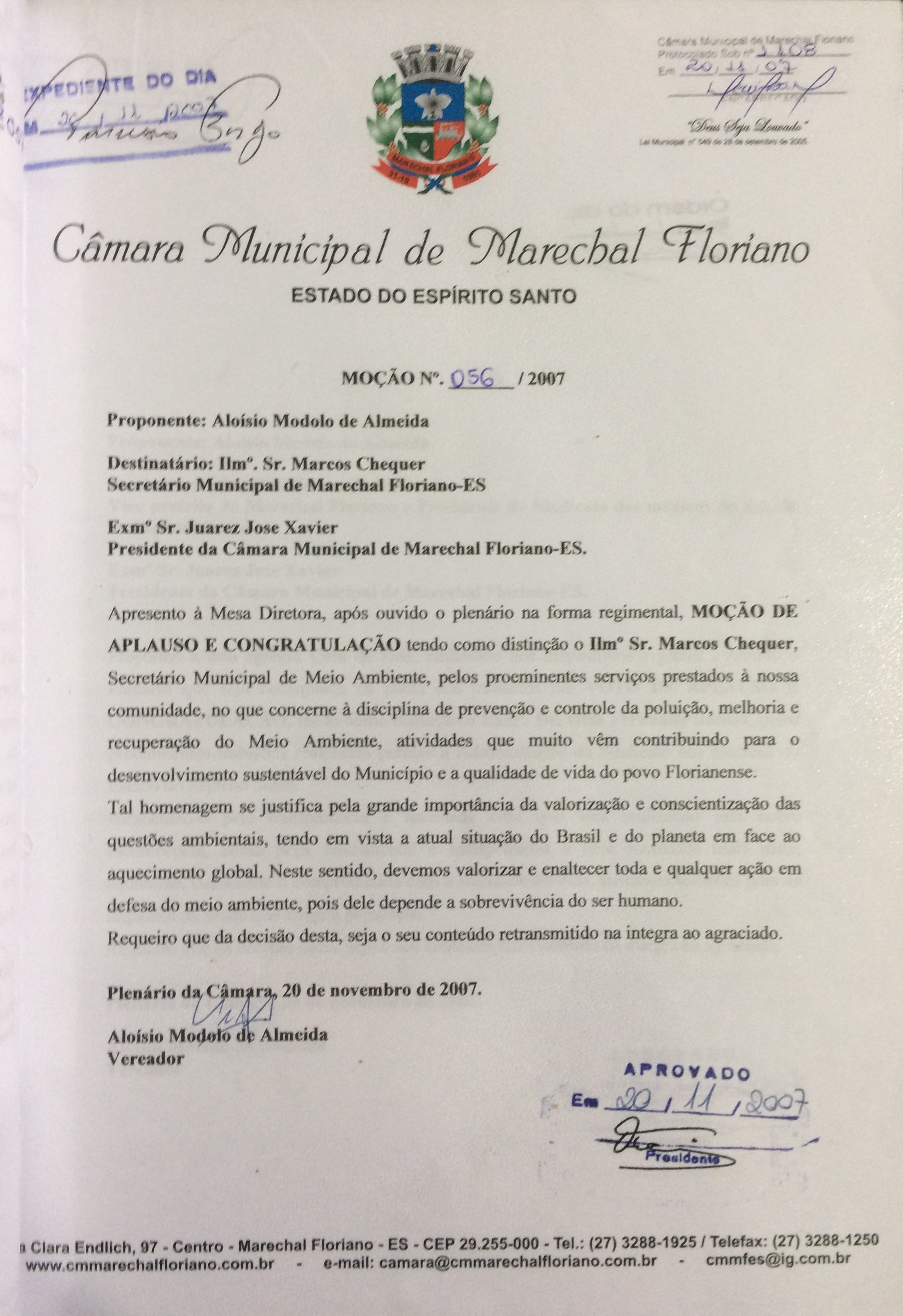 Ementa: MOÇÃO DE APLAUSO E CONGRATULAÇÃO, TENDO COMO DISTINÇÃO OS PROFISSIONAIS VENCEDORES DA ELEIÇÃO DO NOVO CONSELHO TUTELAR DE MARECHAL FLORIANO-ES, REALIZADA NO DIA 27 DE NOVEMBRO DE 2007.