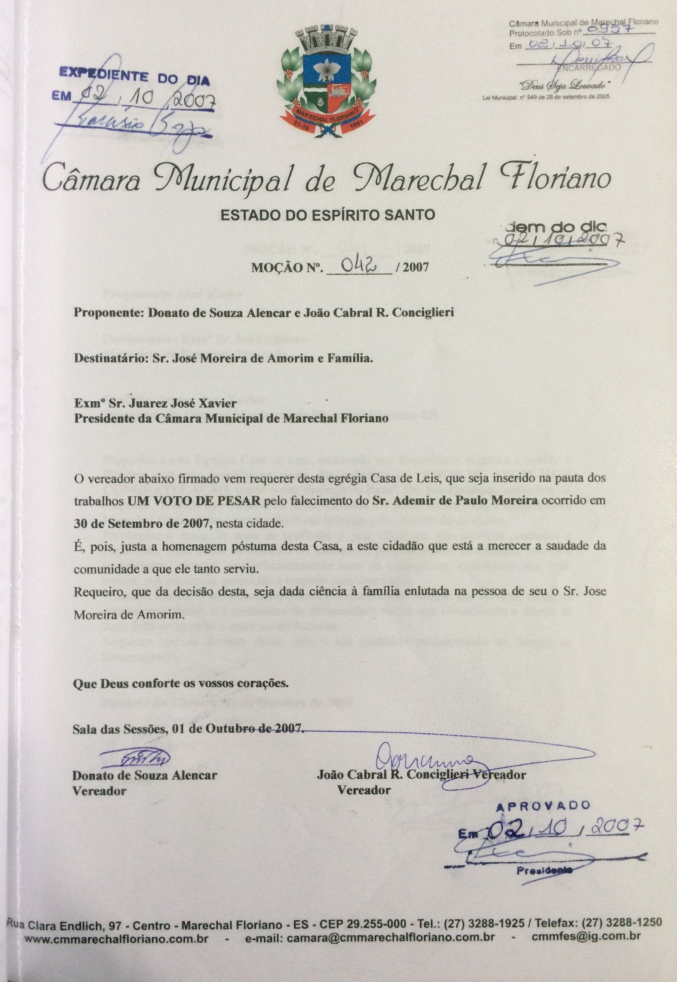 Ementa: MOÇÃO DE PESAR PELO FALECIMENTO DO SR. ADEMIR DE PAULO MOREIRA OCORRIDO EM 30 DE SETEMBRO DE 2007.