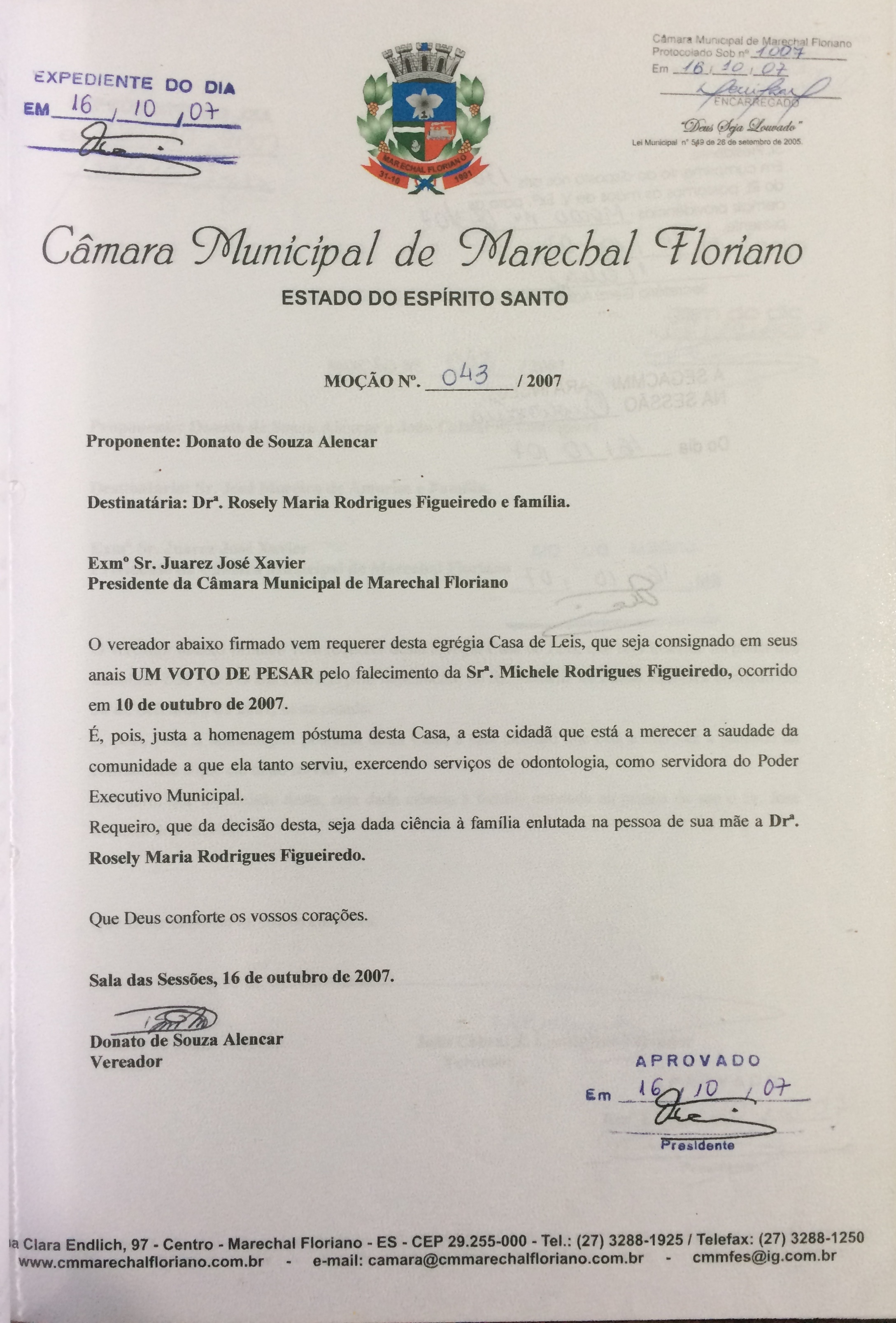 Ementa: MOÇÃO DE PESAR PELO FALECIMENTO DA SRª. MICHELE RODRIGUES FIGUEIREDO, OCORRIDO EM 10 DE OUTUBRO DE 2007.