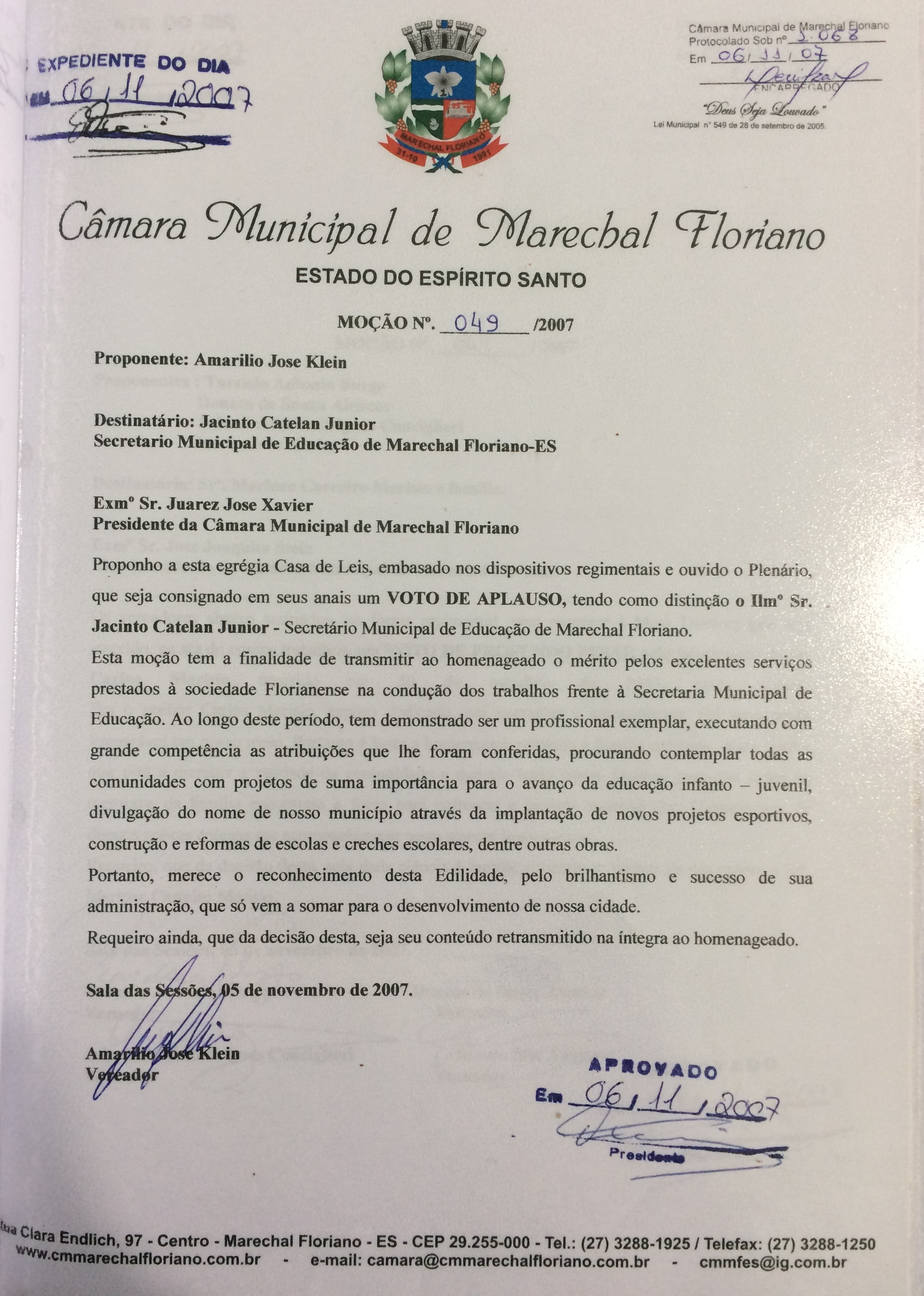 Ementa: MOÇÃO DE APLAUSO TENDO COMO DISTINÇÃO O ILM° SR. JACINTO CATELAN JUNIOR - SECRETÁRIO MUNICIPAL DE EDUCAÇÃO DE MARECHAL FLORIANO.