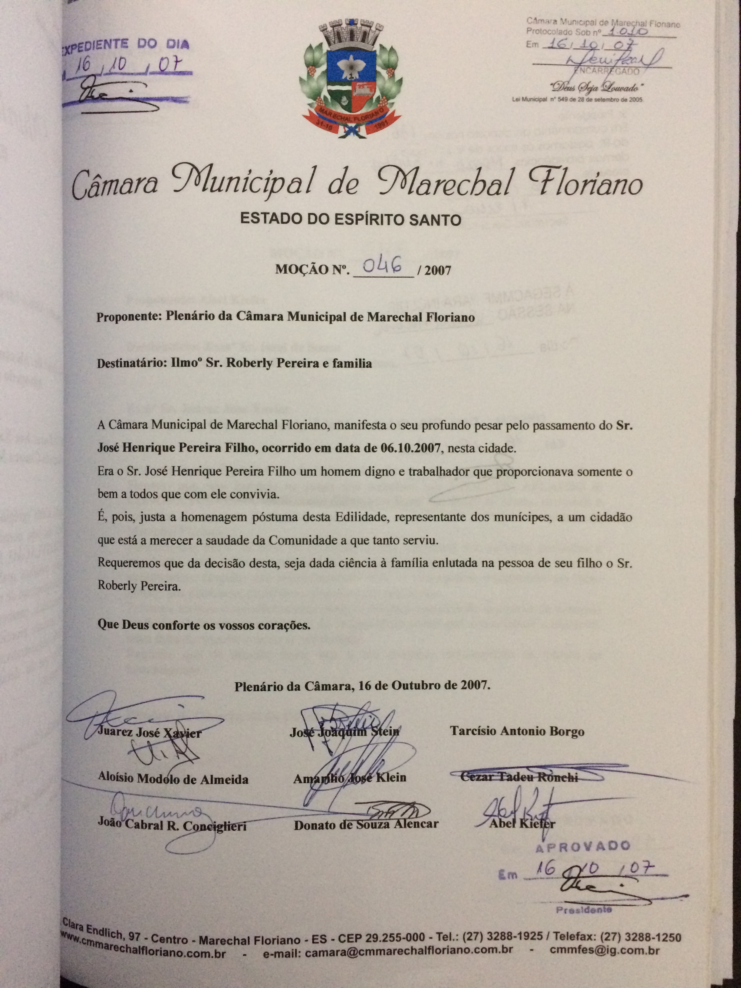 Ementa: MOÇÃO DE PESAR PELO PASSAMENTO DO SR. JOSÉ HENRIQUE PEREIRA FILHO, OCORRIDO EM DATA DE 06/10/2007, NESTA CIDADE.