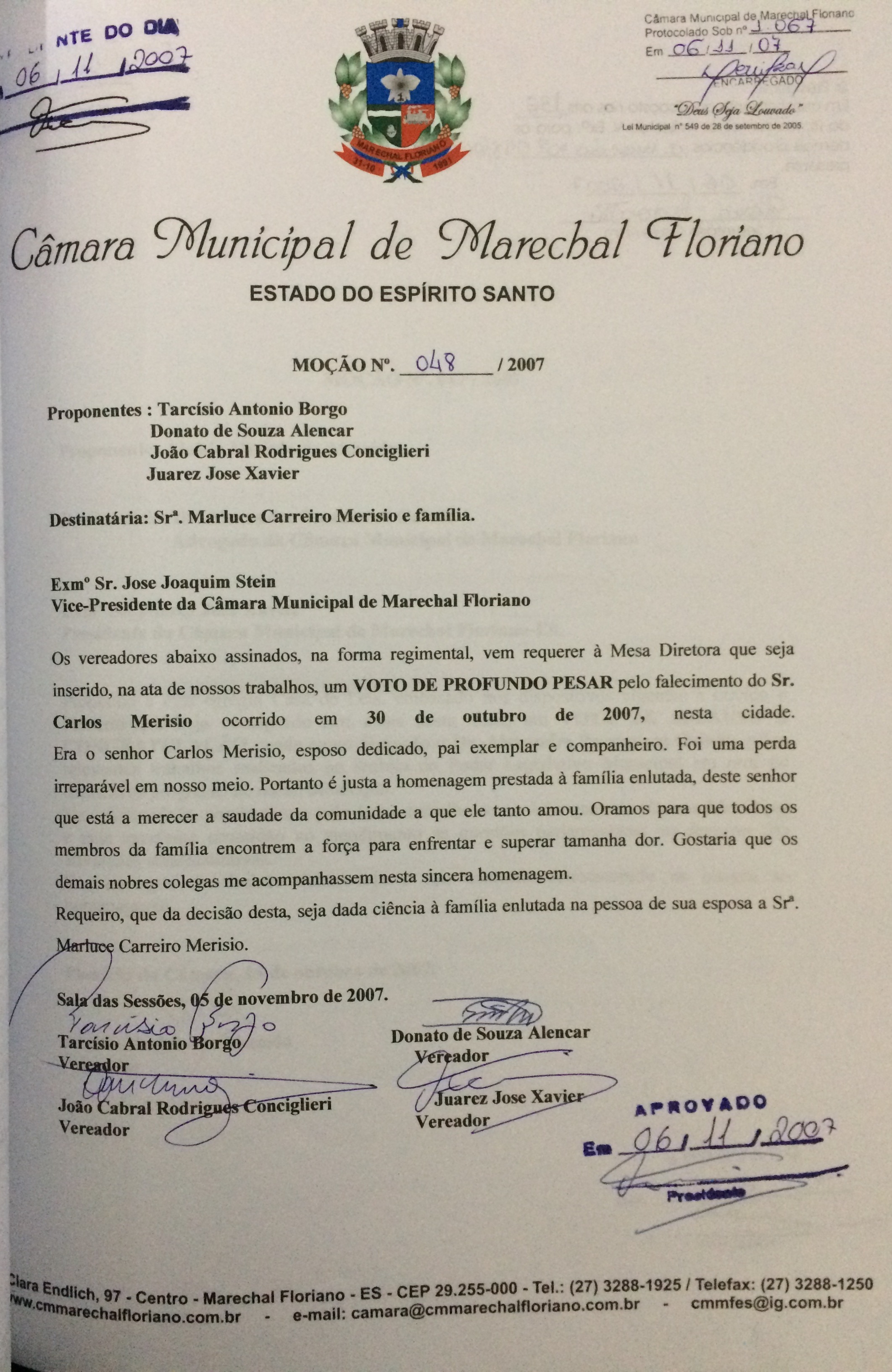 Ementa: MOÇÃO DE PROFUNDO PESAR PELO FALECIMENTO DO SR. CARLOS MERISIO OCORRIDO EM 30 DE OUTUBRO DE 2007.