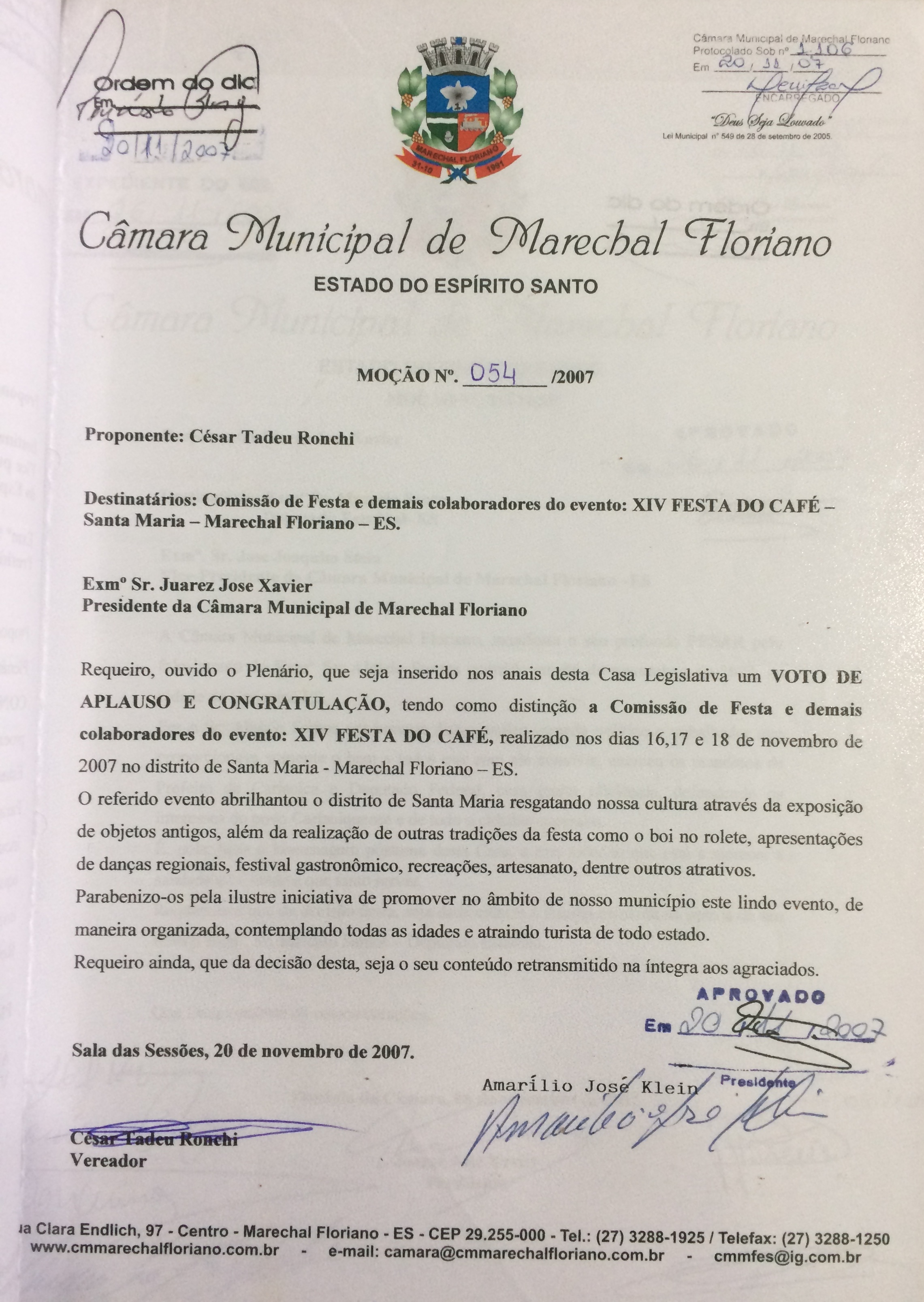Ementa: MOÇÃO DE APLAUSO E CONGRATULAÇÃO, TENDO COMO DISTINÇÃO O SR. JACINTO CATELAN JUNIOR E OS SERVIDORES DA SECRETARIA MUNICIPAL DE EDUCAÇÃO, CULTURA E ESPORTES, À COMISSÃO DE FESTA: A SRª. LUCINÉIA GUIMARÃES, SRª. LUCINEIDE VENTURINI RONCHI, SRª. MARGARIDA MARIA RONCHI MARQUES, SR. CEZAR TADEU RONCHI, SRª. APARECIDA MARIA TRABACH, SRª. MARIA DA PENHA SILVA E DEMAIS COLABORADORES DO EVENTO: I ENCONTRO DA CULTURA ITALIANA DE ARAGUAYA - MARECHAL FLORIANO - ES.