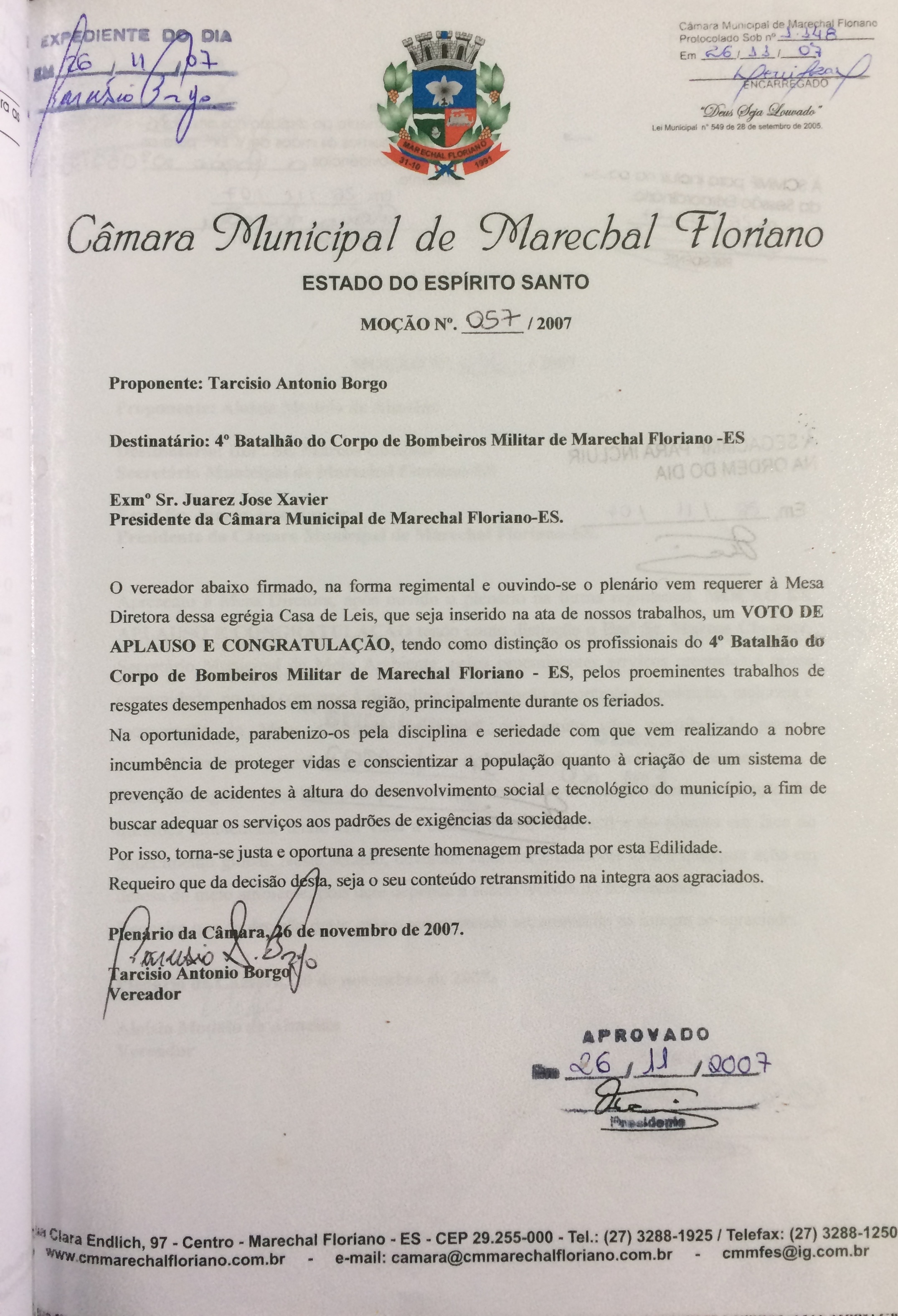 Ementa: MOÇÃO DE APLAUSO E CONGRATULAÇÃO, TENDO COMO DISTINÇÃO OS PROFISSIONAIS DO 4°BATALHÃO DO CORPO DE BOMBEIROS MILITAR DE MARECHAL FLORIANO - ES.
