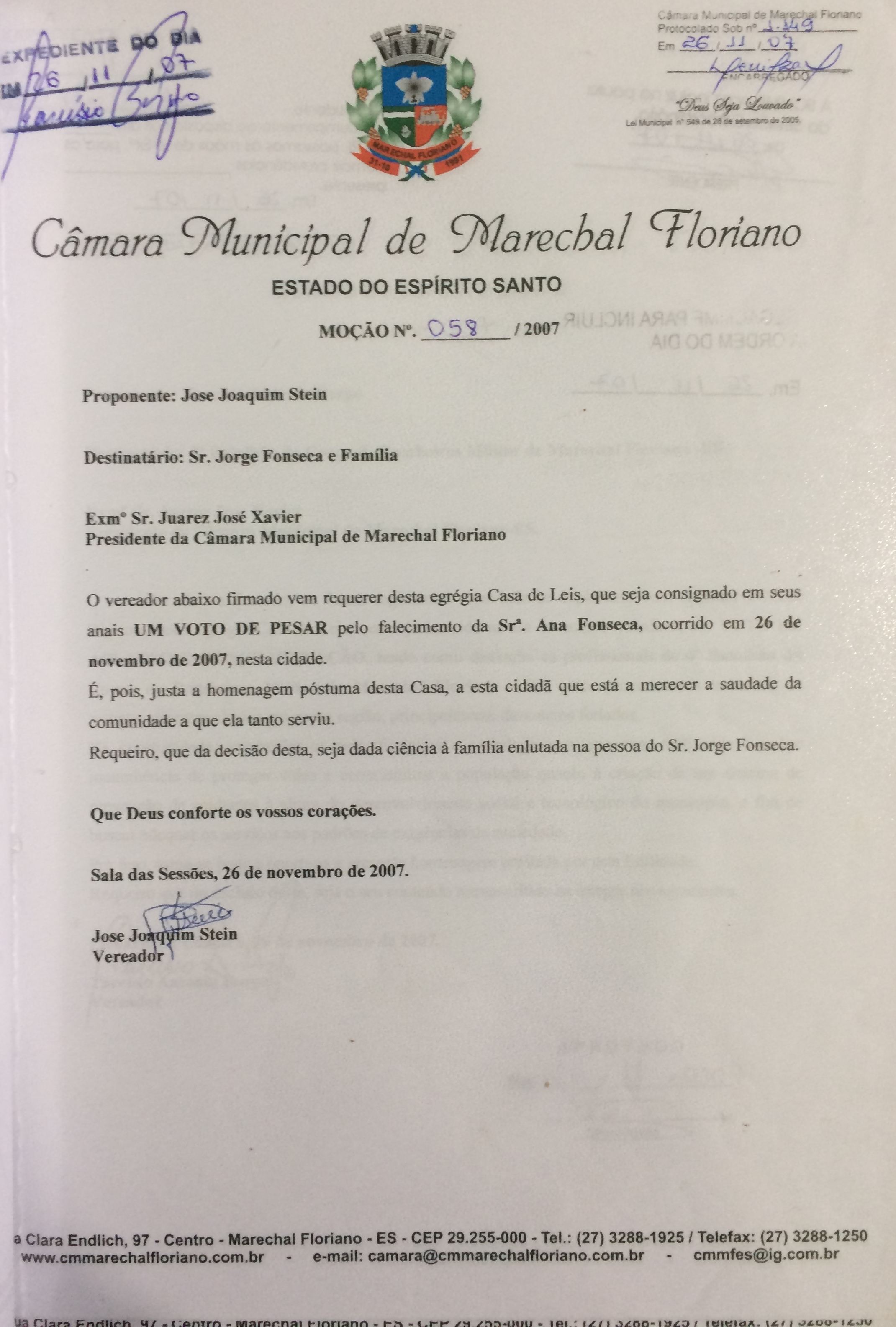 Ementa: MOÇÃO DE PESAR PELO FALECIMENTO DA SRª. ANA FONSECA, OCORRIDO EM 26 DE NOVEMBRO DE 2007, NESTA CIDADE.