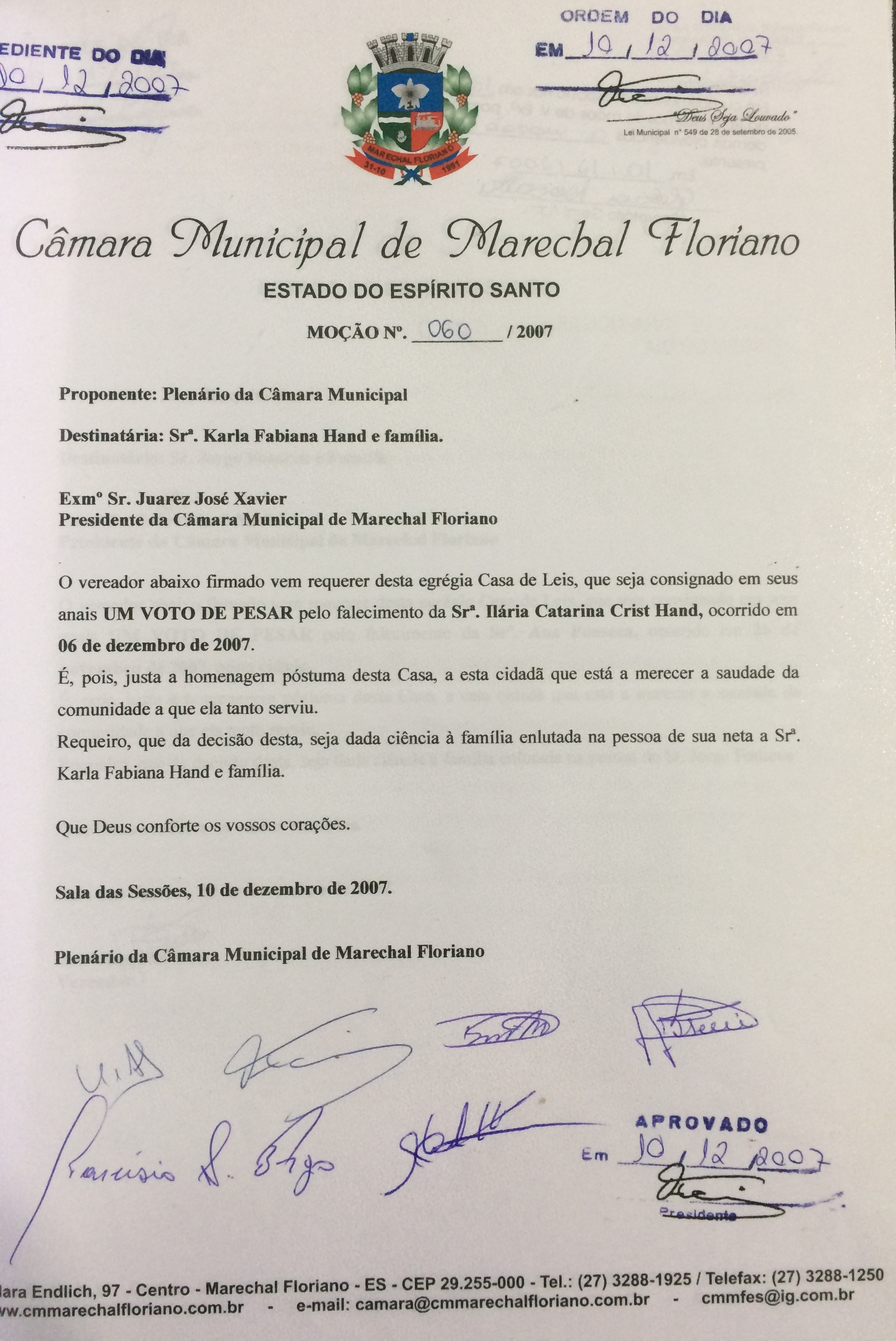 Ementa: MOÇÃO DE PESAR PELO FALECIMENTO DA SRª. ILÁRIA CATARINA CRIST HAND, OCORRIDO EM 06 DE DEZEMBRO DE 2007.