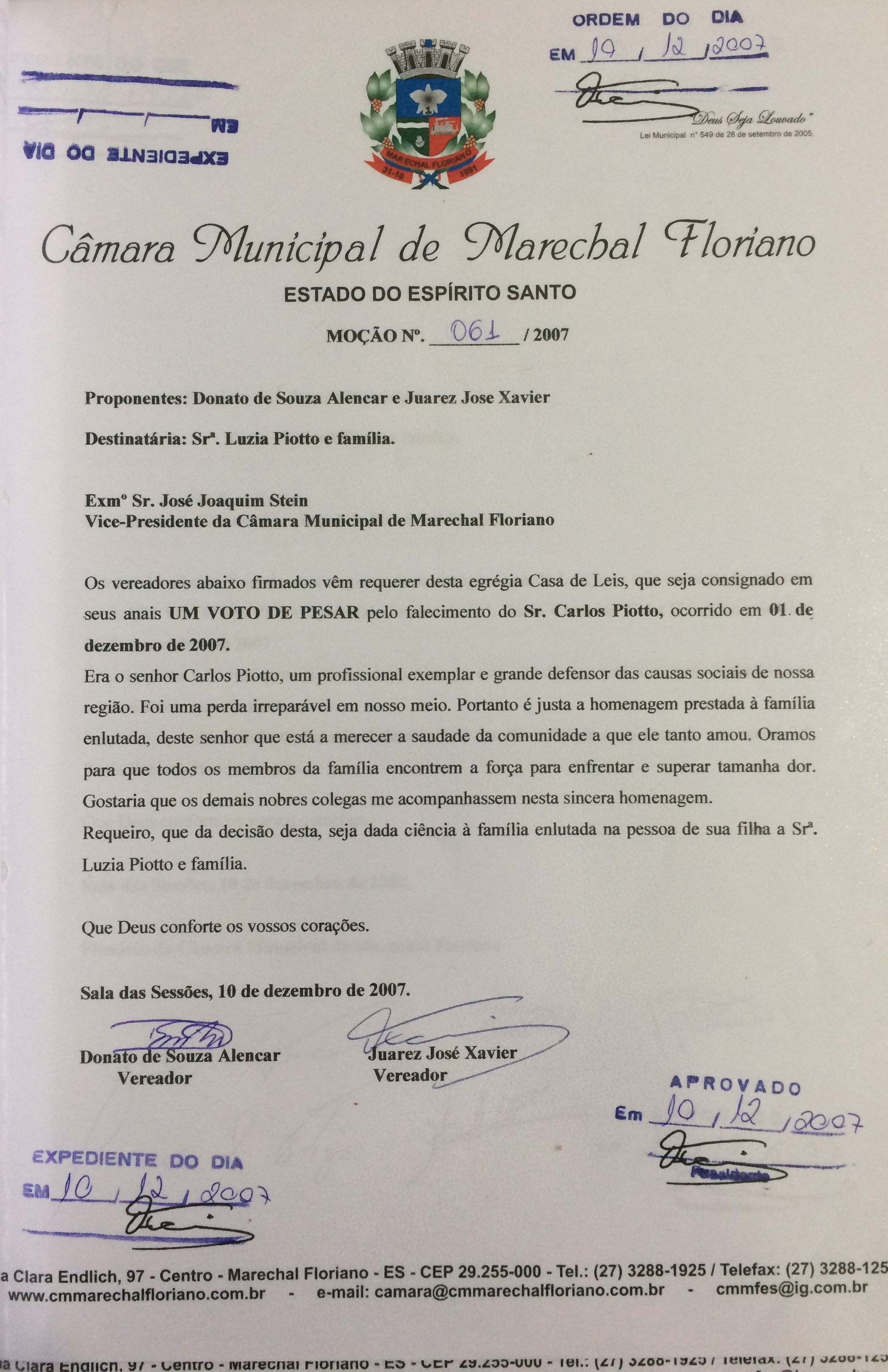 Ementa: MOÇÃO DE PESAR PELO FALECIMENTO DO SR. CARLOS PIOTTO, OCORRIDO EM 01 DE DEZEMBRO DE 2007.