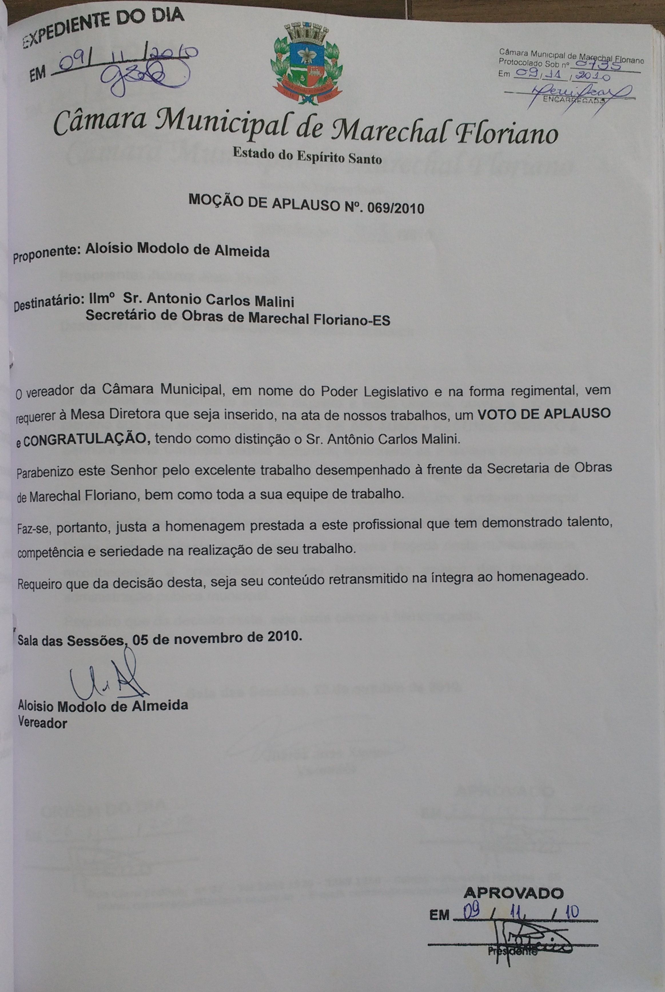 Ementa: VOTO DE APLAUSO E CONGRATULAÇÃO AO SR. ANTÔNIO CARLOS MALINI