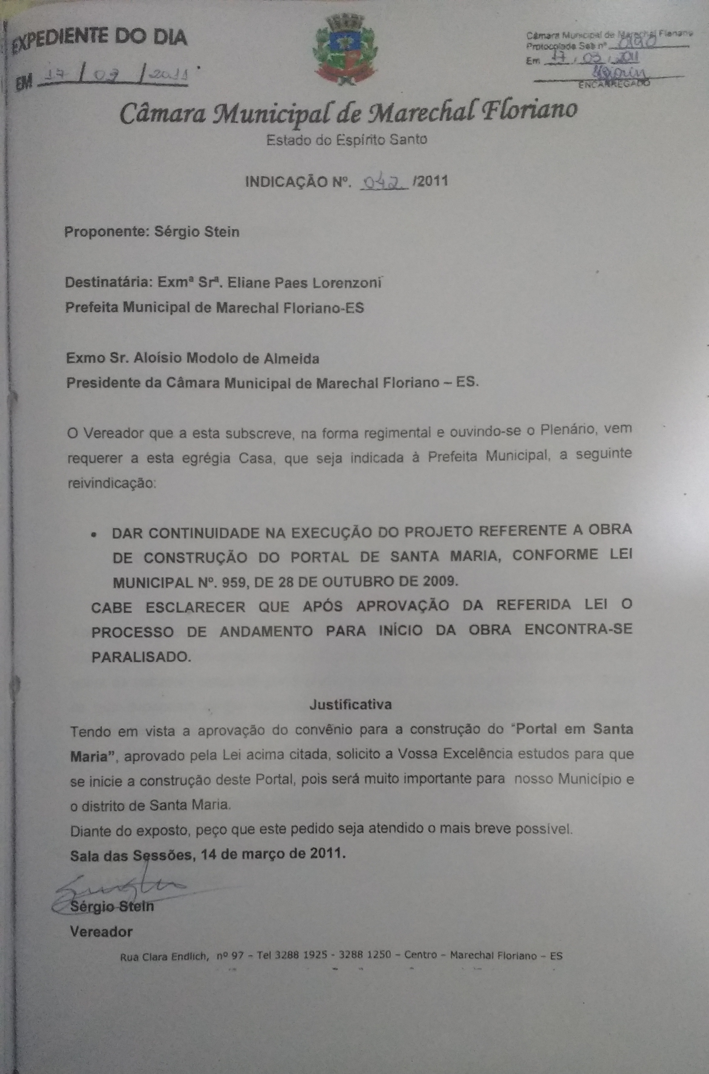 Ementa: DAR CONTINUIDADE NA EXECUÇÃO DO PROJETO REFERENTE A OBRA DE CONSTRUÇÃO DO PORTAL DE SANTA MARIA, CONFORME LEI MUNICIPAL N°.959, DE 28 DE OUTUBRO DE 2009.