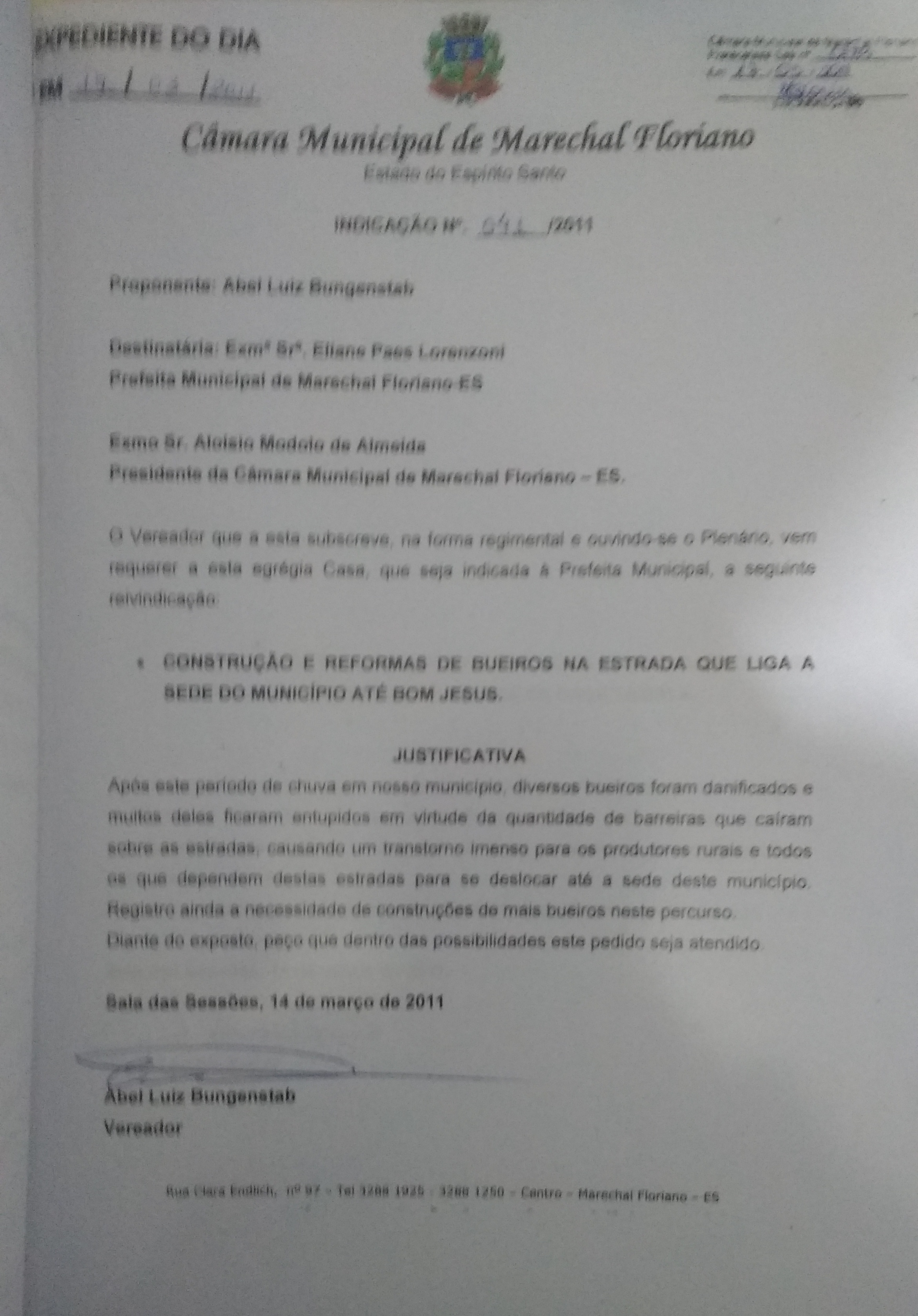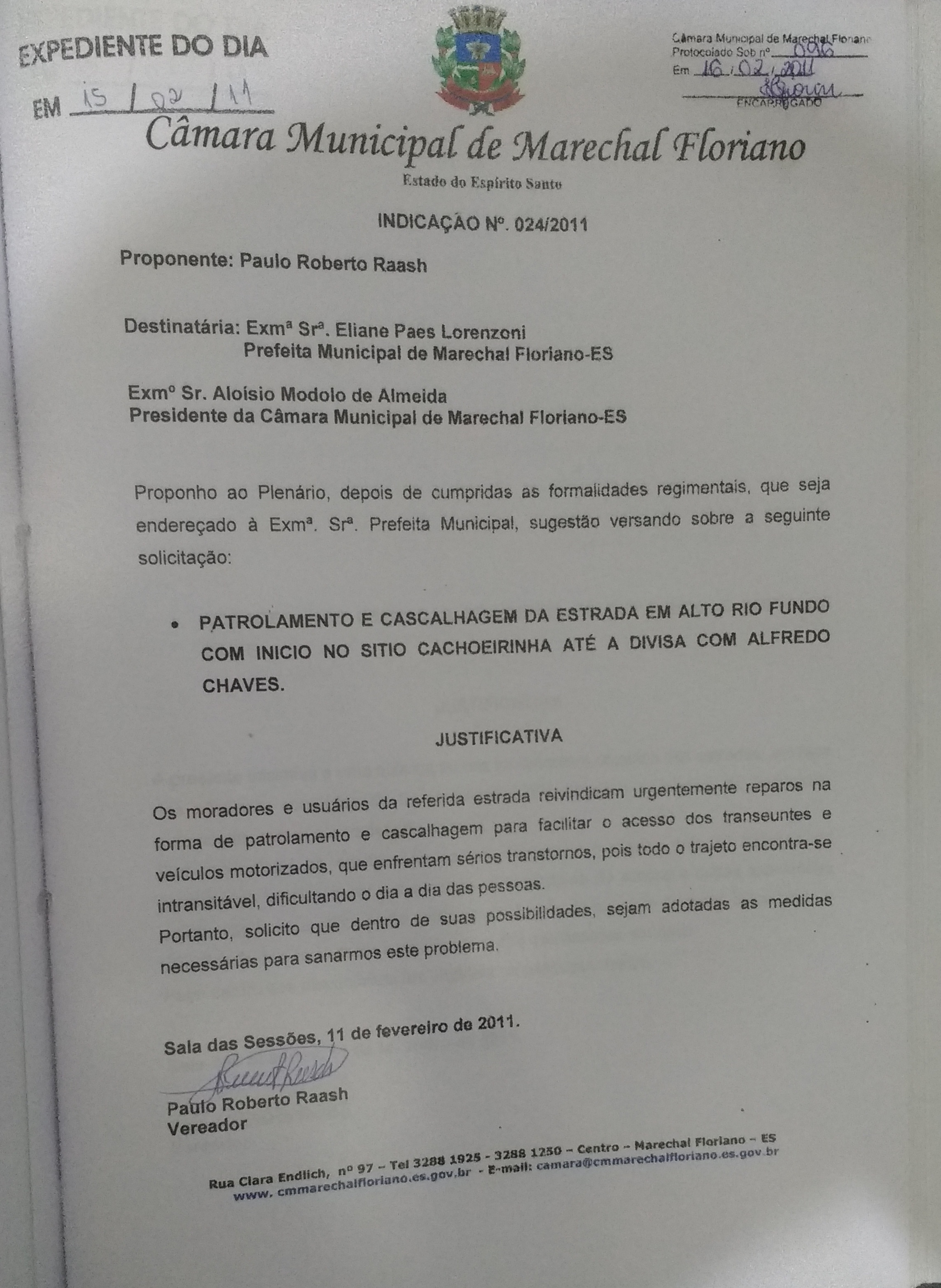 Ementa: PATROLAMENTO E CASCALHAGEM DA ESTRADA EM ALTO RIO FUNDO COM INICIO NO SITIO CACHOEIRINHA ATÉ A DIVISA COM ALFREDO CHAVES.