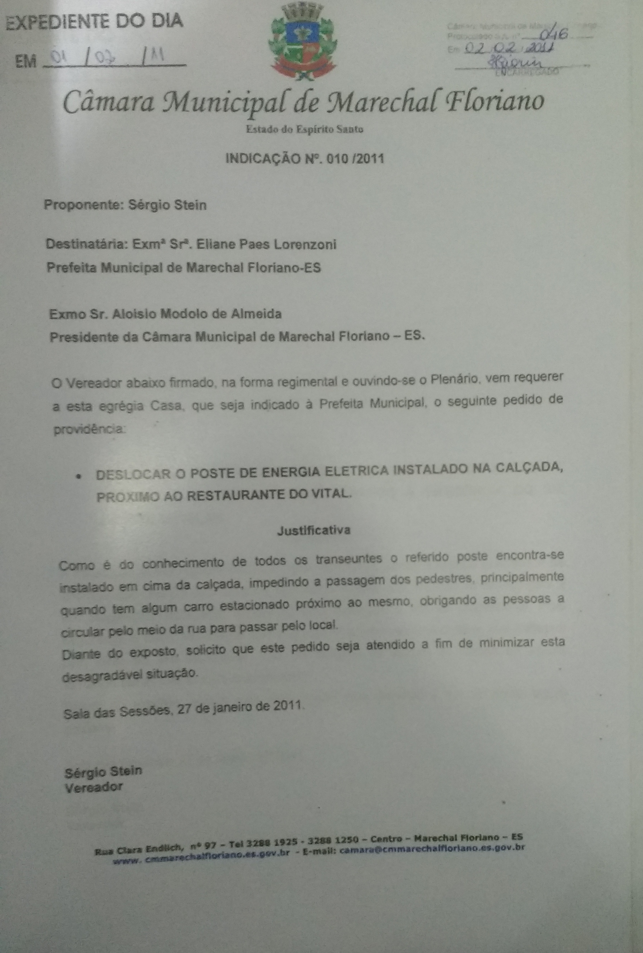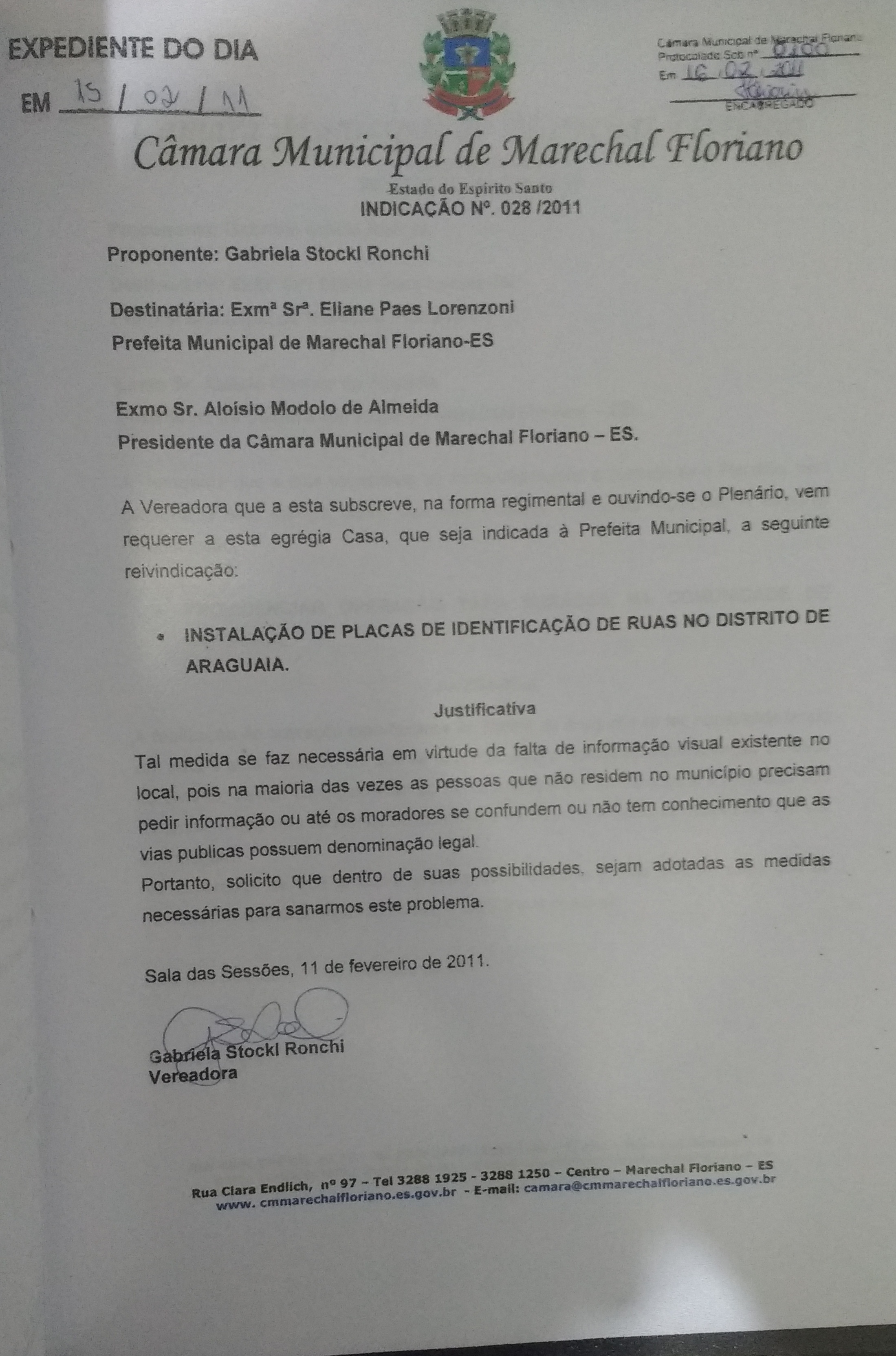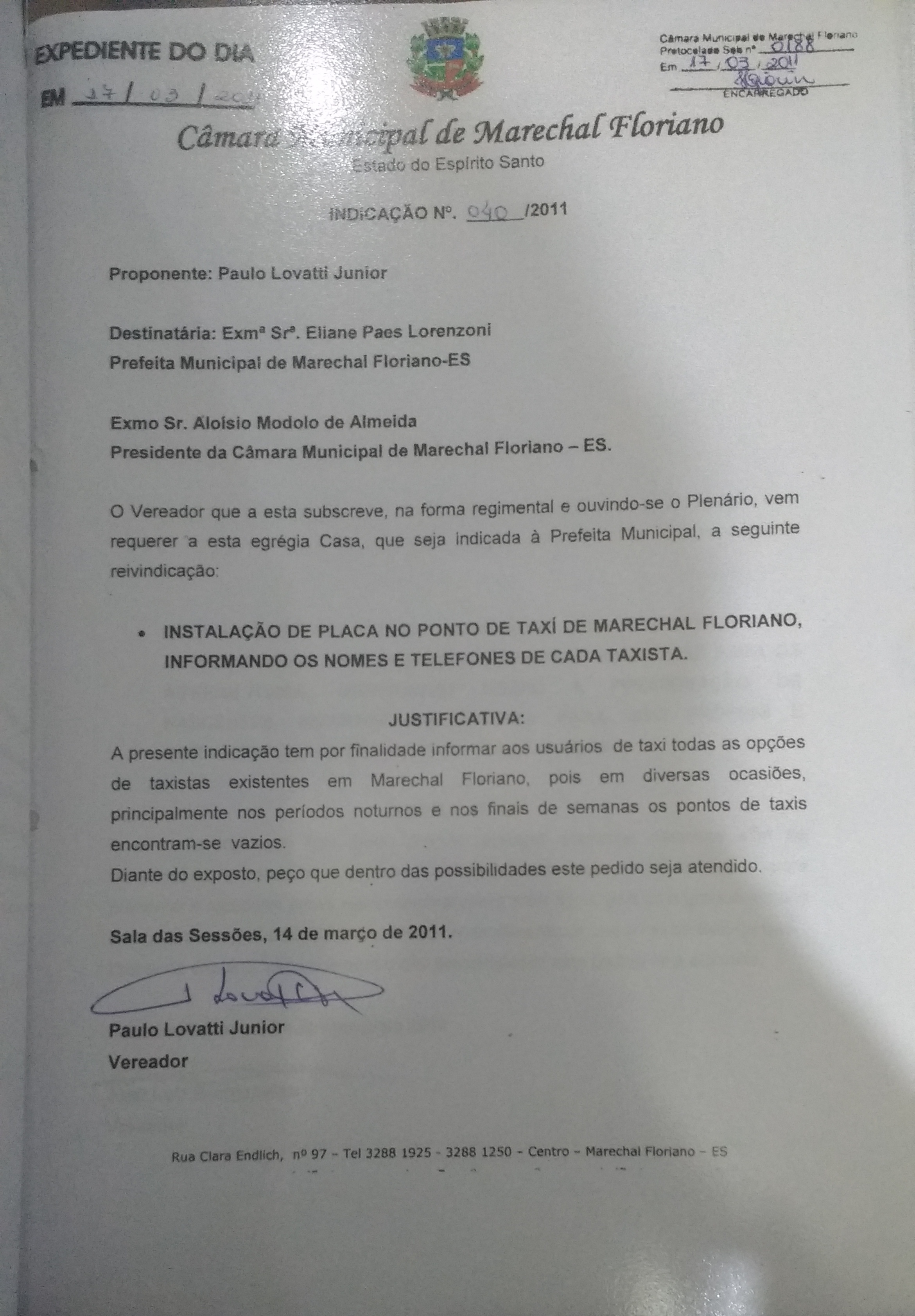 Ementa: INSTALAÇÃO DE PLACA NO PONTO DE TÁXI DE MARECHAL FLORIANO, INFORMANDO OS NOMES E TELEFONES CADA TAXISTA.