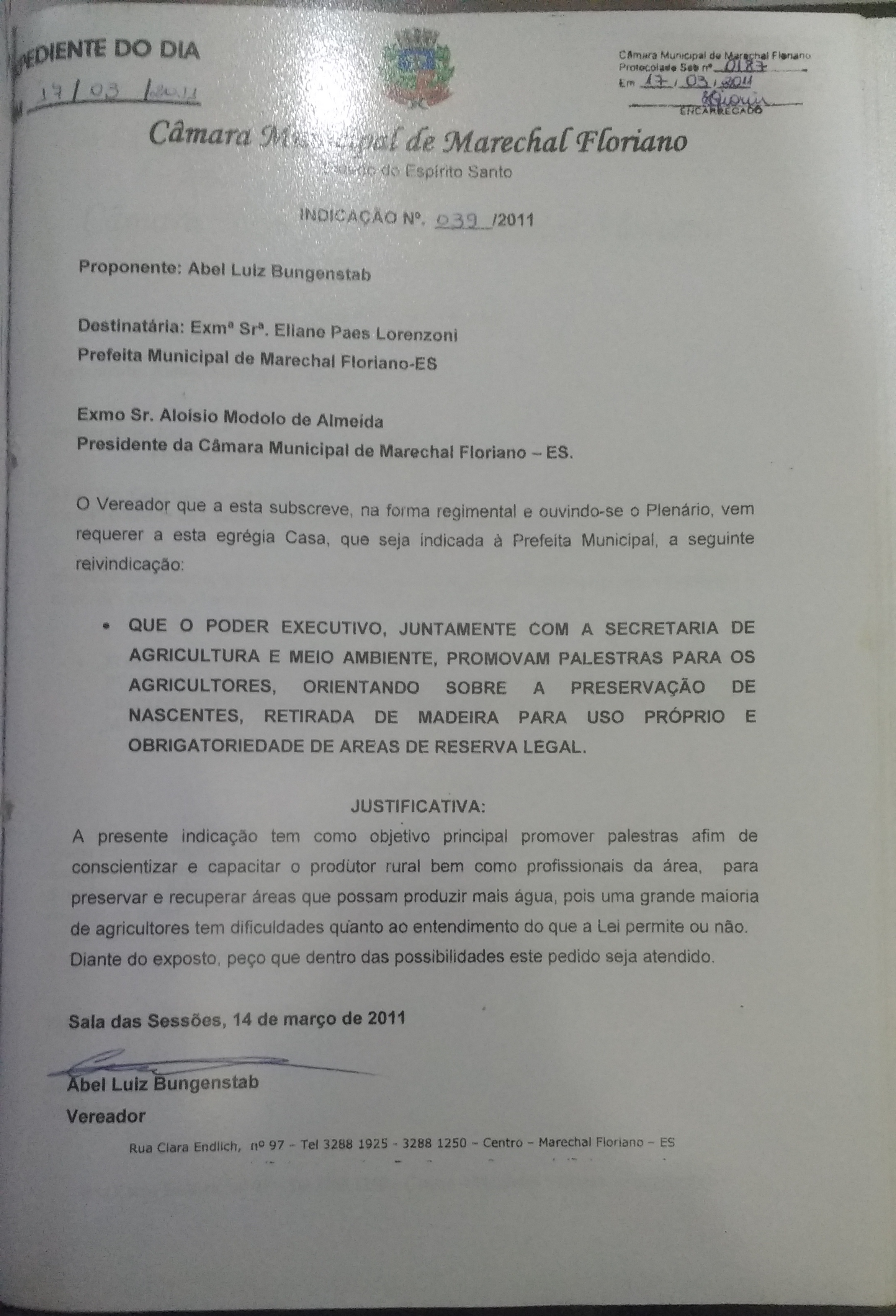Ementa: QUE O PODER EXECUTIVO, JUNTAMENTE COM A SECRETARIA DE AGRICULTURA E MEIO AMBIENTE, PROMOVAM PALESTRAS PARA OS AGRICULTORES, ORIENTANDO SOBRE A PRESERVAÇÃO DE NASCENTES, RETIRADA DE MADEIRA PARA O USO PRÓPRIO E OBRIGATORIEDADE DE ÁREAS DE RESERVA LEGAL.