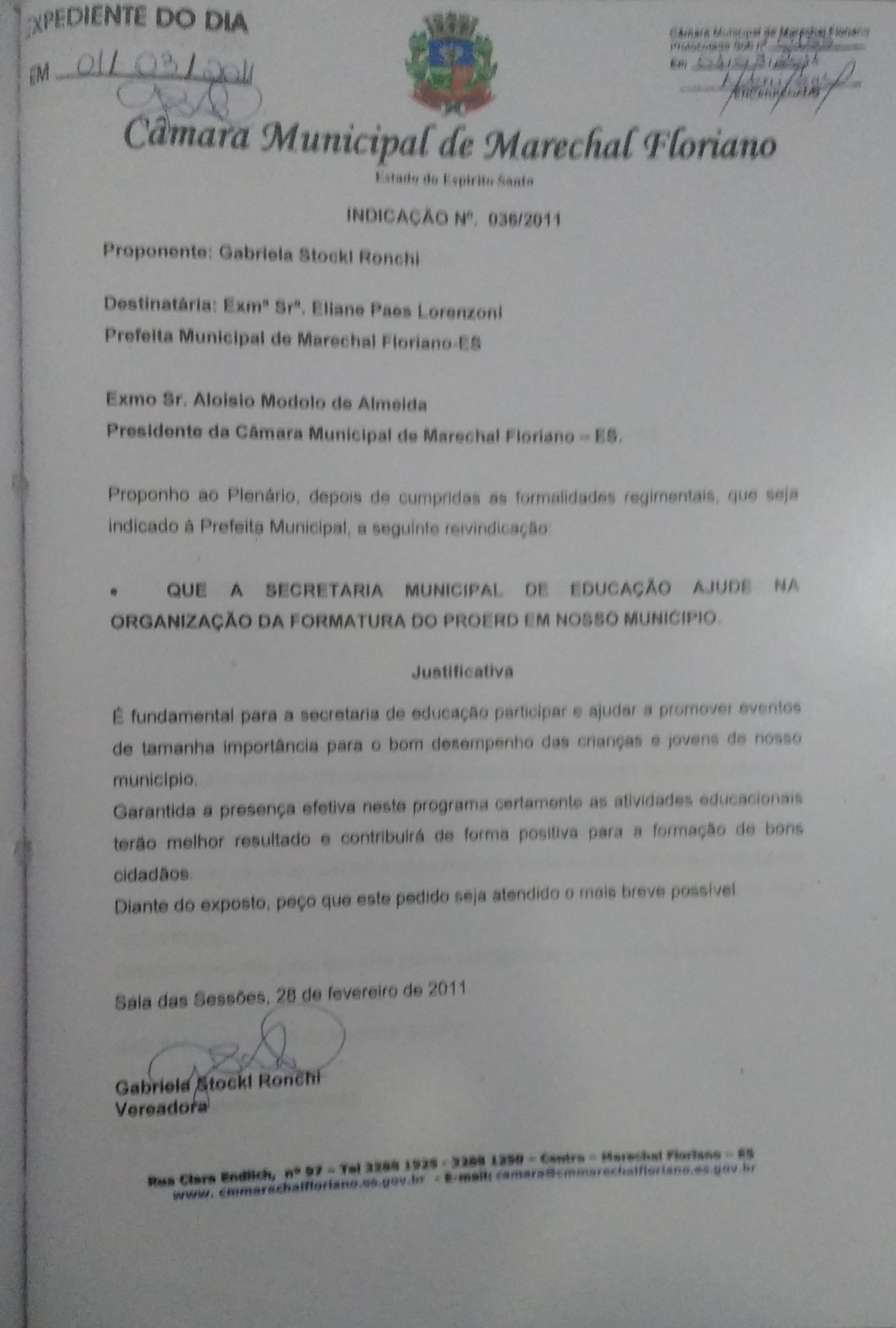 Ementa: QUE A SECRETARIA MUNICIPAL DE EDUCAÇÃO AJUDE NA ORGANIZAÇÃO DA FORMATURA DO PROERD EM NOSSO MUNICÍPIO.