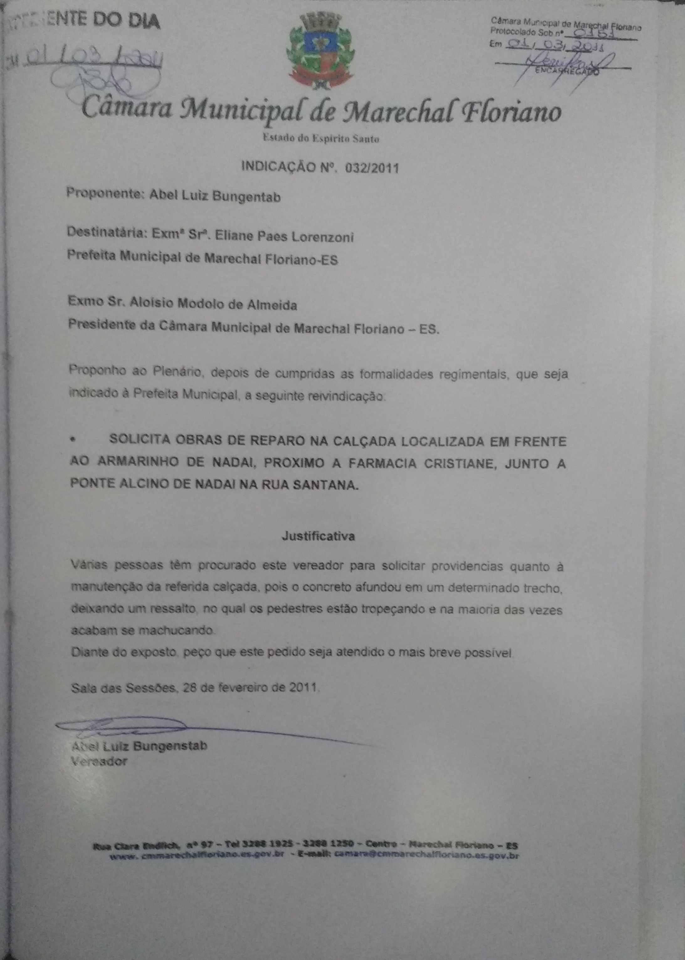 Ementa: SOLICITA OBRAS DE REPARO NA CALÇADA LOCALIZADA EM FRENTE AO ARMARINHO DE NADAI, PRÓXIMO A FARMACIA CRISTIANE, JUNTO A PONTE ALCINO DE NADAI NA RUA SANTANA.