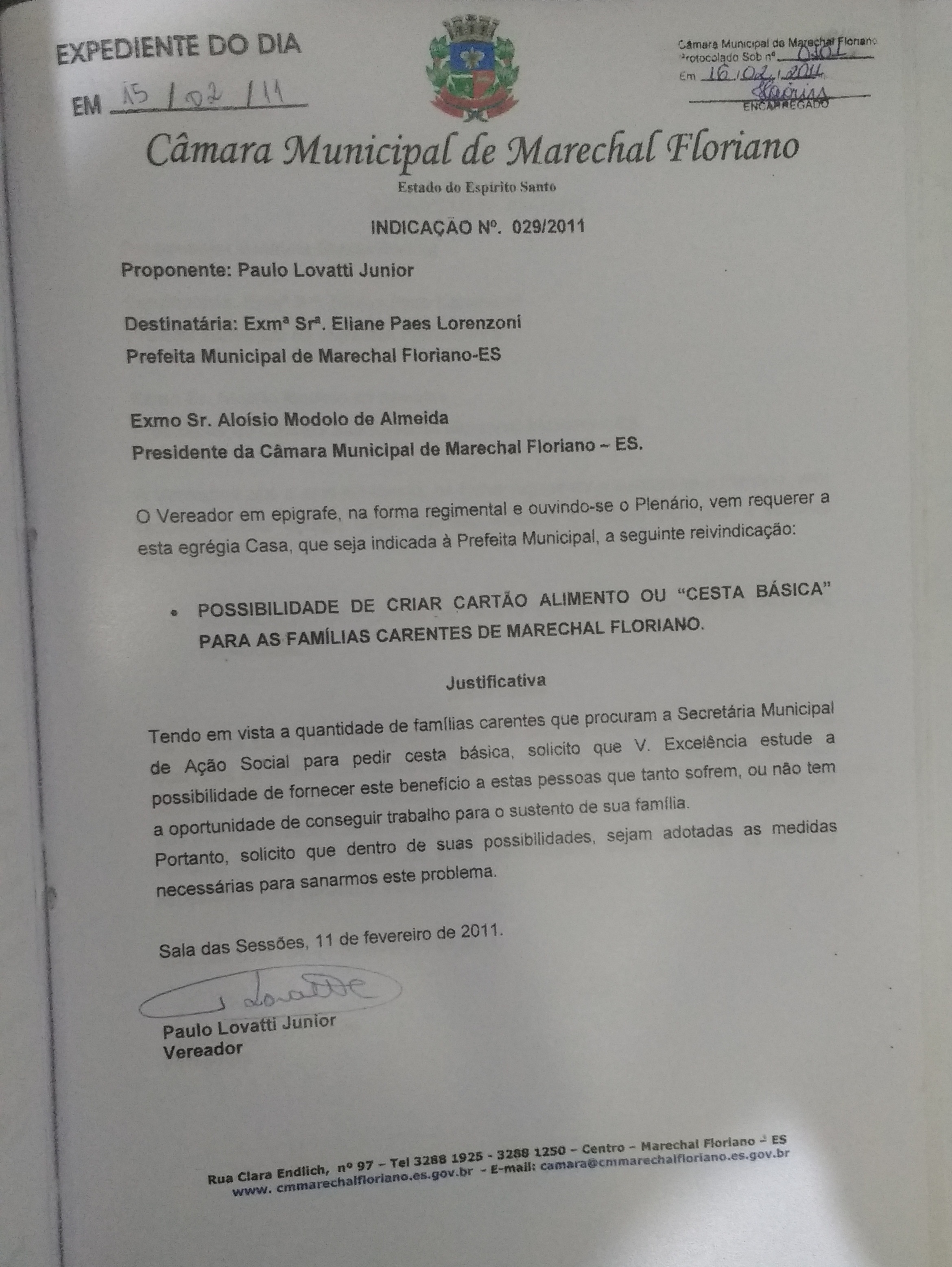 Ementa: POSSIBILIDADE DE CRIAR CARTÃO ALIMENTO OU "CESTA BÁSICA" PARA AS FAMÍLIAS CARENTES EM MARECHAL FLORIANO.