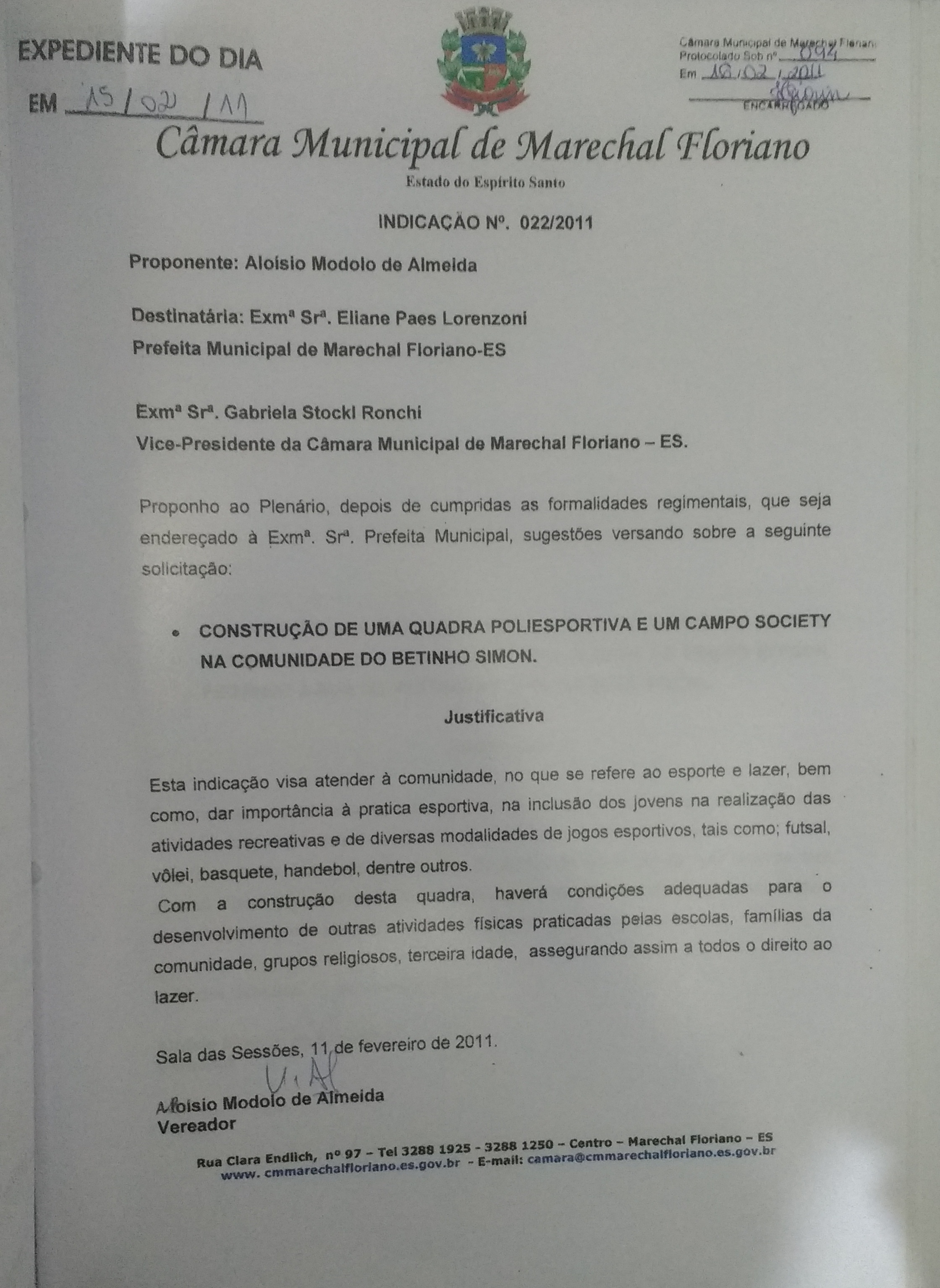 Ementa: CONSTRUÇÃO DE UMA QUADRA POLIESPORTIVA E UM CAMPO SOCIETY NA COMUNIDADE DO BETINHO SIMON.