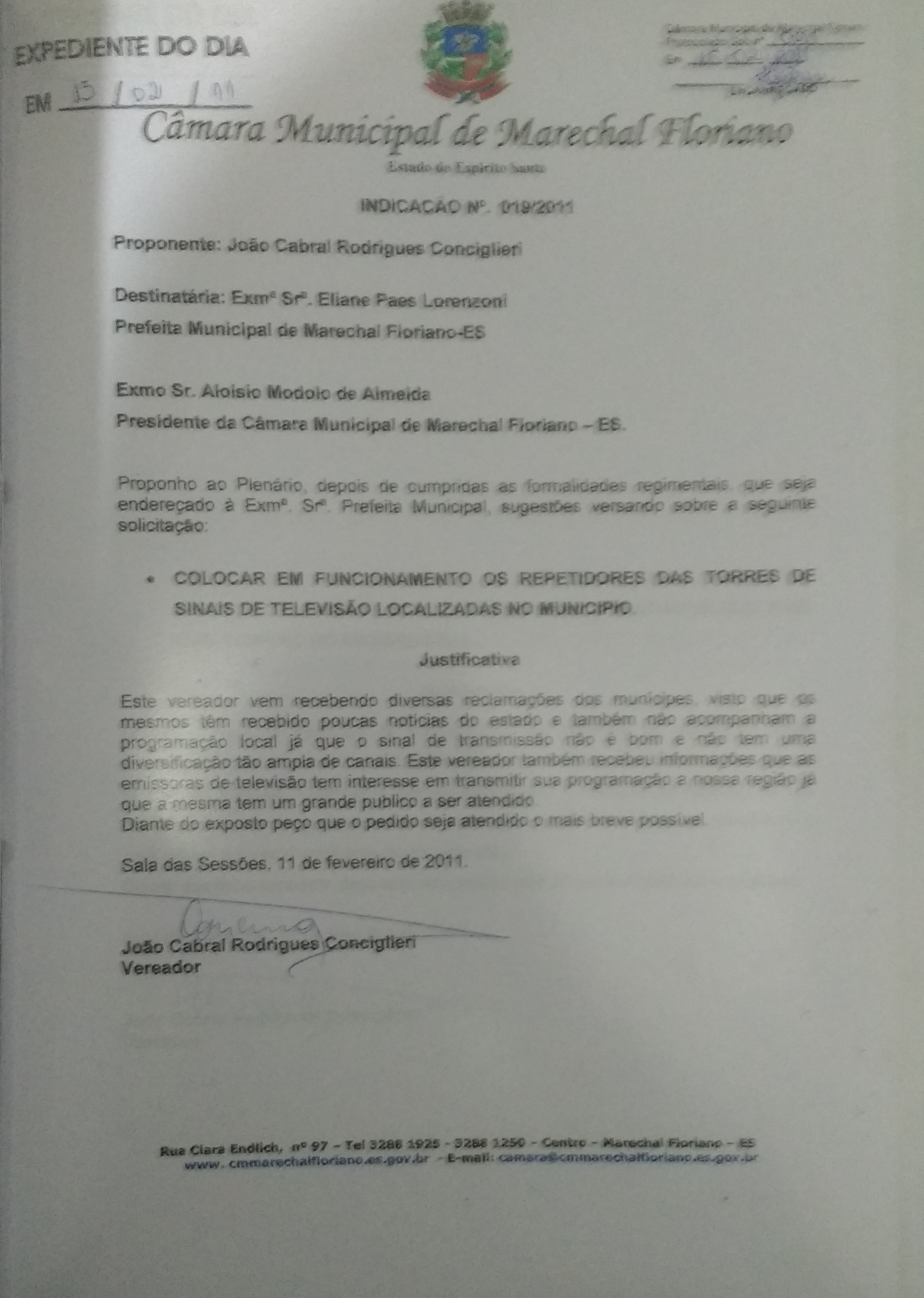 Ementa: COLOCAR EM FUNCIONAMENTO OS REPETIDORES DAS TORRES DE SINAIS DE TELEVISÃO LOCALIZADAS NO MUNICÍPIO.