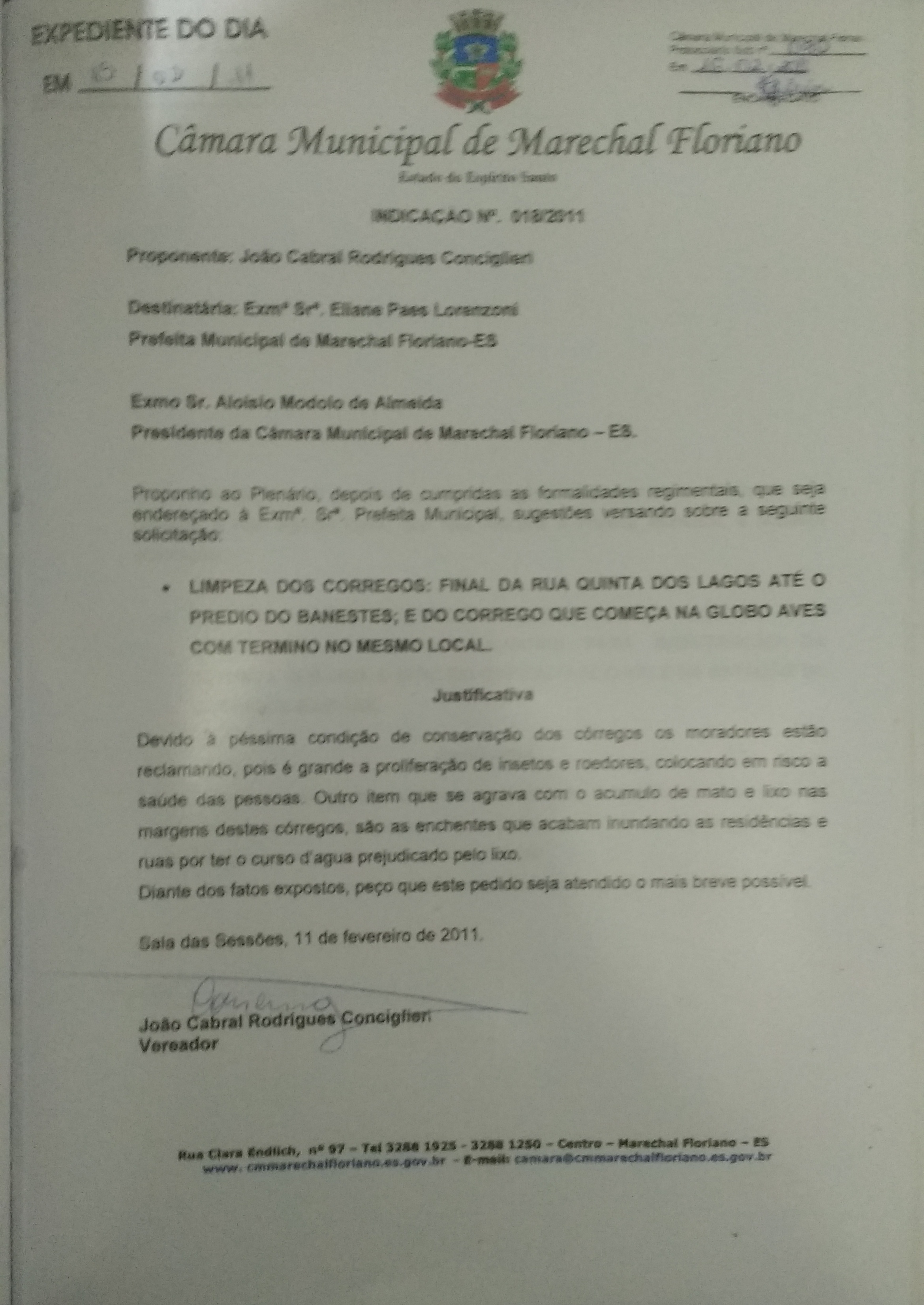 Ementa: LIMPEZA DOS CÓRREGOS: FINAL DA RUA QUINTA DOS LAGOS ATÉ O PRÉDIO DO BANESTES; E DO CÓRREGO NA GLOBO AVES COM TERMINO NO MESMO LOCAL.
