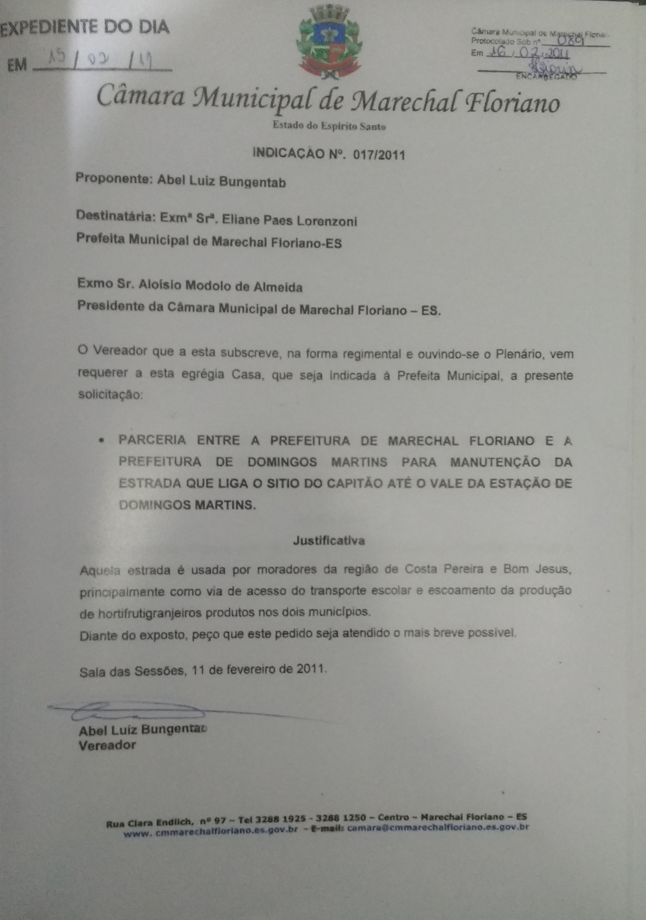 Ementa: PARCERIA ENTRE A PREFEITURA DE MARECHAL FLORIANO E A PREFEITURA DE DOMINGOS MARTINS PARA MANUTENÇÃO DA ESTRADA QUE LIGA O SITIO DO CAPITÃO ATÉ O VALE DA ESTAÇÃO DE DOMINGOS MARTINS.