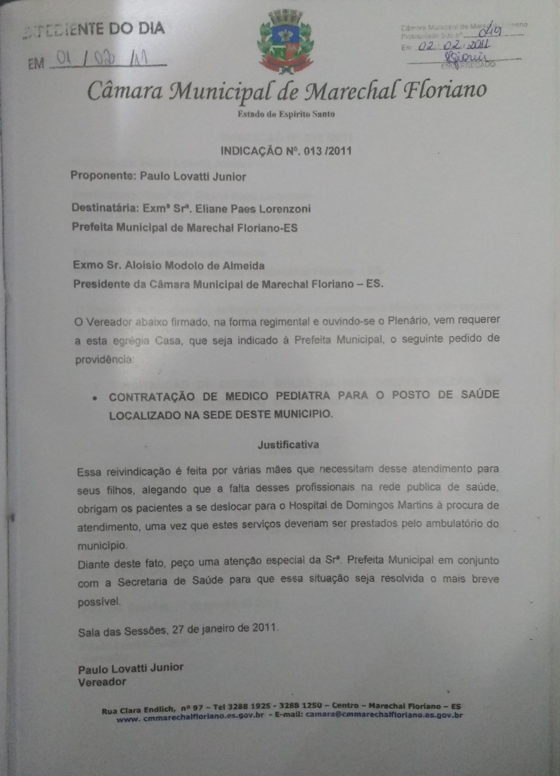 Ementa: DISPONIBILIZAR UM MEDICO PEDIATRA PARA ATENDIMENTO NO POSTO DE SANTA RITA.