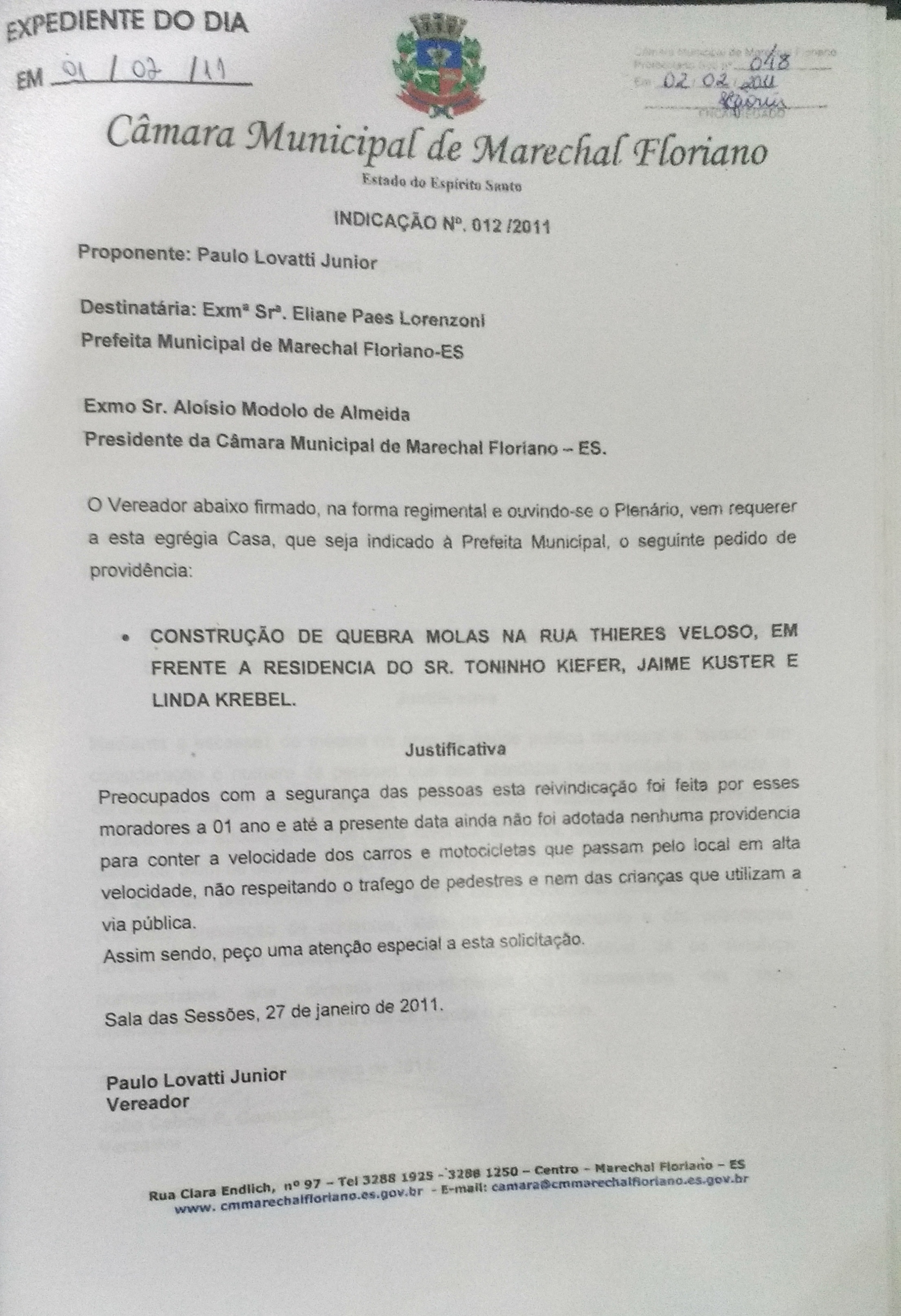 Ementa: CONSTRUÇÃO DE QUEBRA MOLAS NA RUA THIERES VELOSO, EM FRENTE A RESIDENCIA DO SR. TONINHO KIEFER, JAIME KUSTER E LINDA KREBEL.
