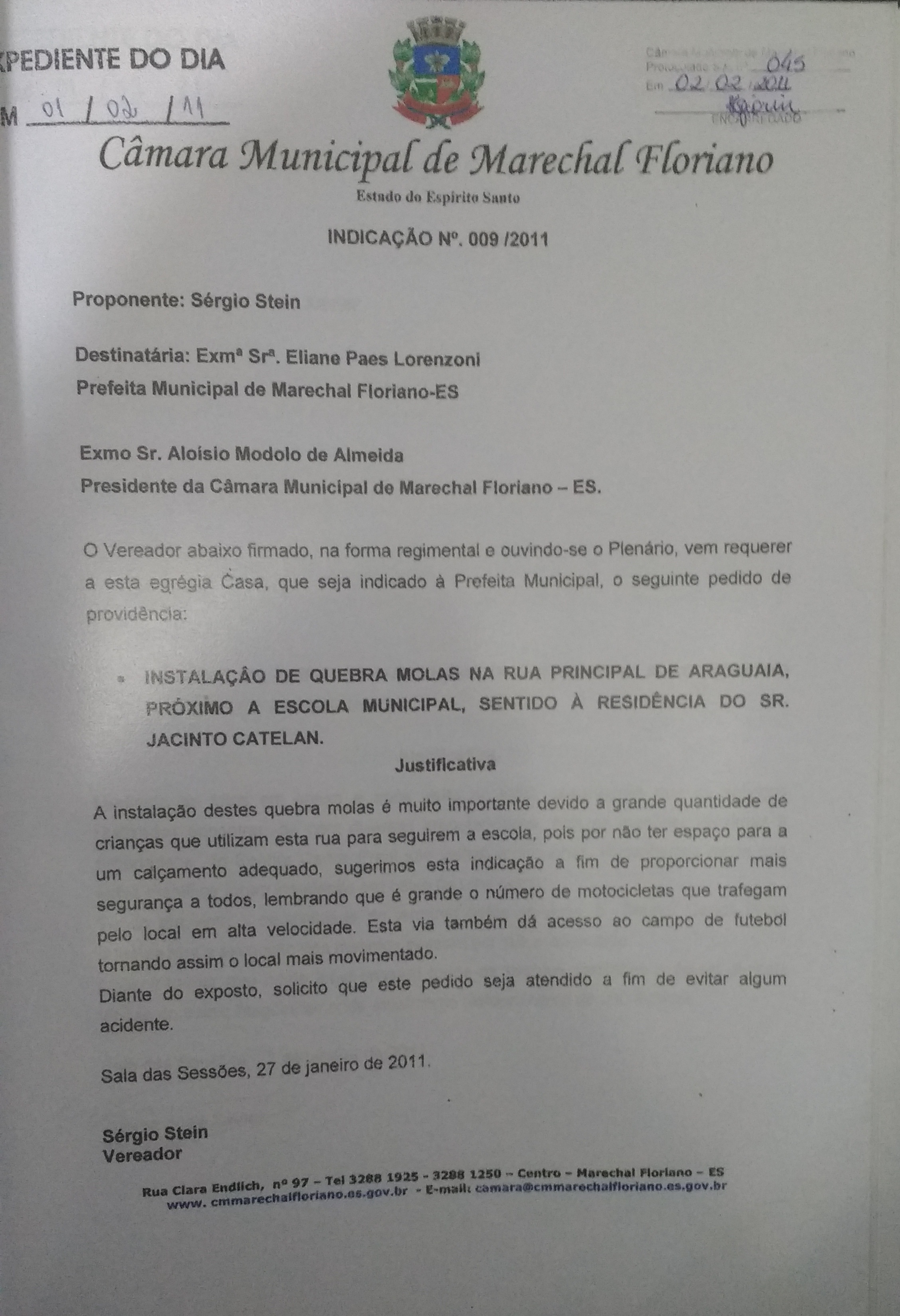 Ementa: INSTALAÇÃO DE QUEBRA MOLAS NA RUA PRINCIPAL DE ARAGUAIA, PRÓXIMO A ESCOLA MUNICIPAL, SENTIDO À RESIDENCIA DO SR. JACINTO CATELAN.