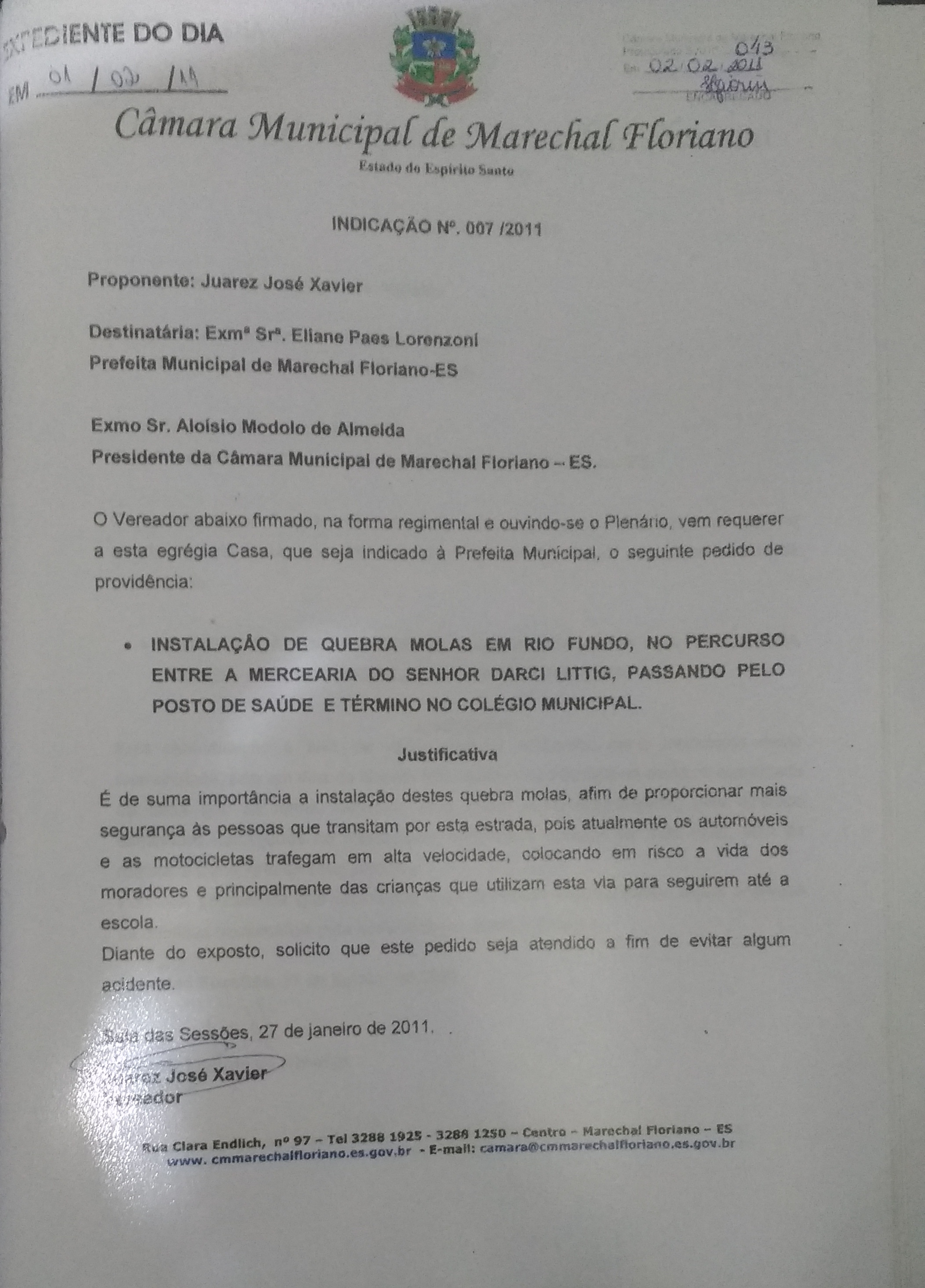 Ementa: INSTALAÇÃO DE QUEBRA MOLAS EM RIO FUNDO, NO PERCURSO ENTRE A MERCEARIA DO SENHOR DARCI LITTG, PASSANDO PELO POSTO DE SAÚDE E TÉRMINO NO COLÉGIO MUNICIPAL.