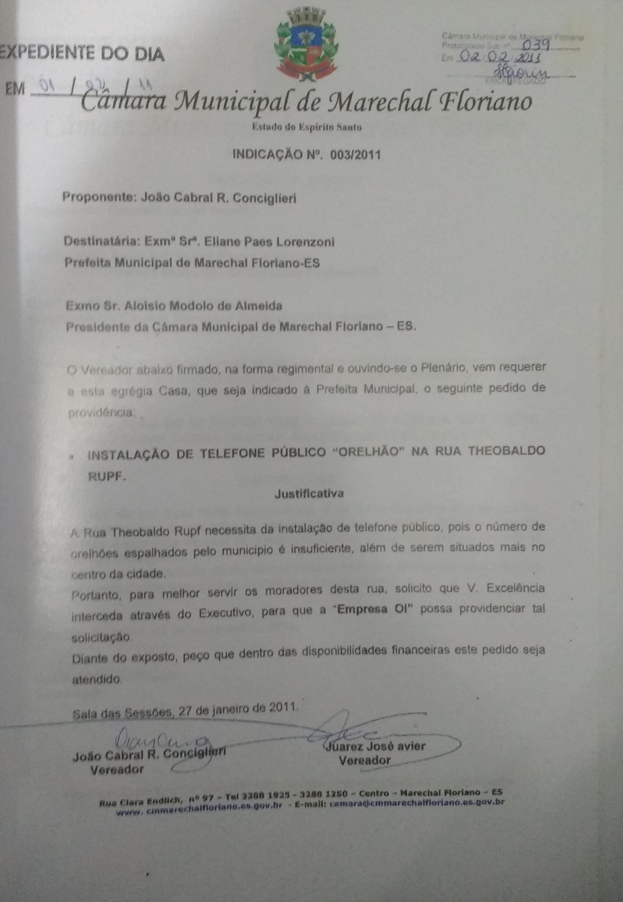 Ementa: INSTALAÇÃO DE TELEFONE PÚBLICO "ORELHÃO" NA RUA THEOBALDO RUPF.
