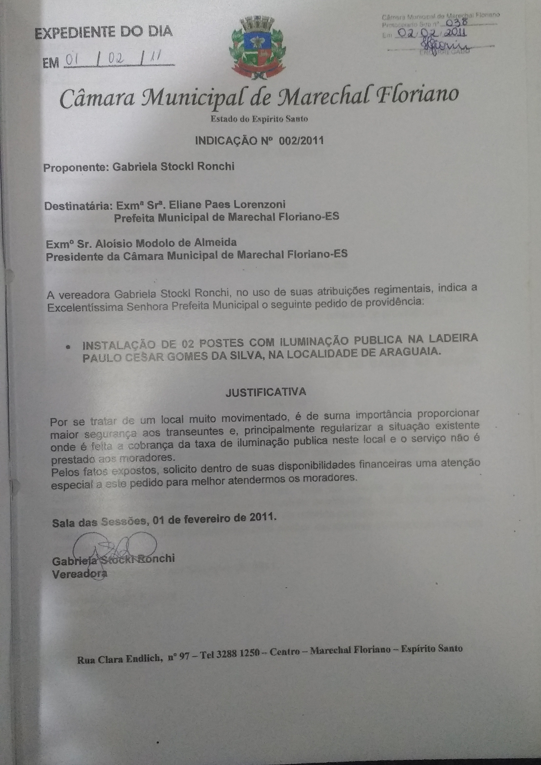 Ementa: INSTALAÇÃO DE 02 POSTES COM ILUMINAÇÃO PUBLICA NA LADEIRA PAULO CESAR GOMES DA SILVA, NA LOCALIDADE DE ARAGUAIA.