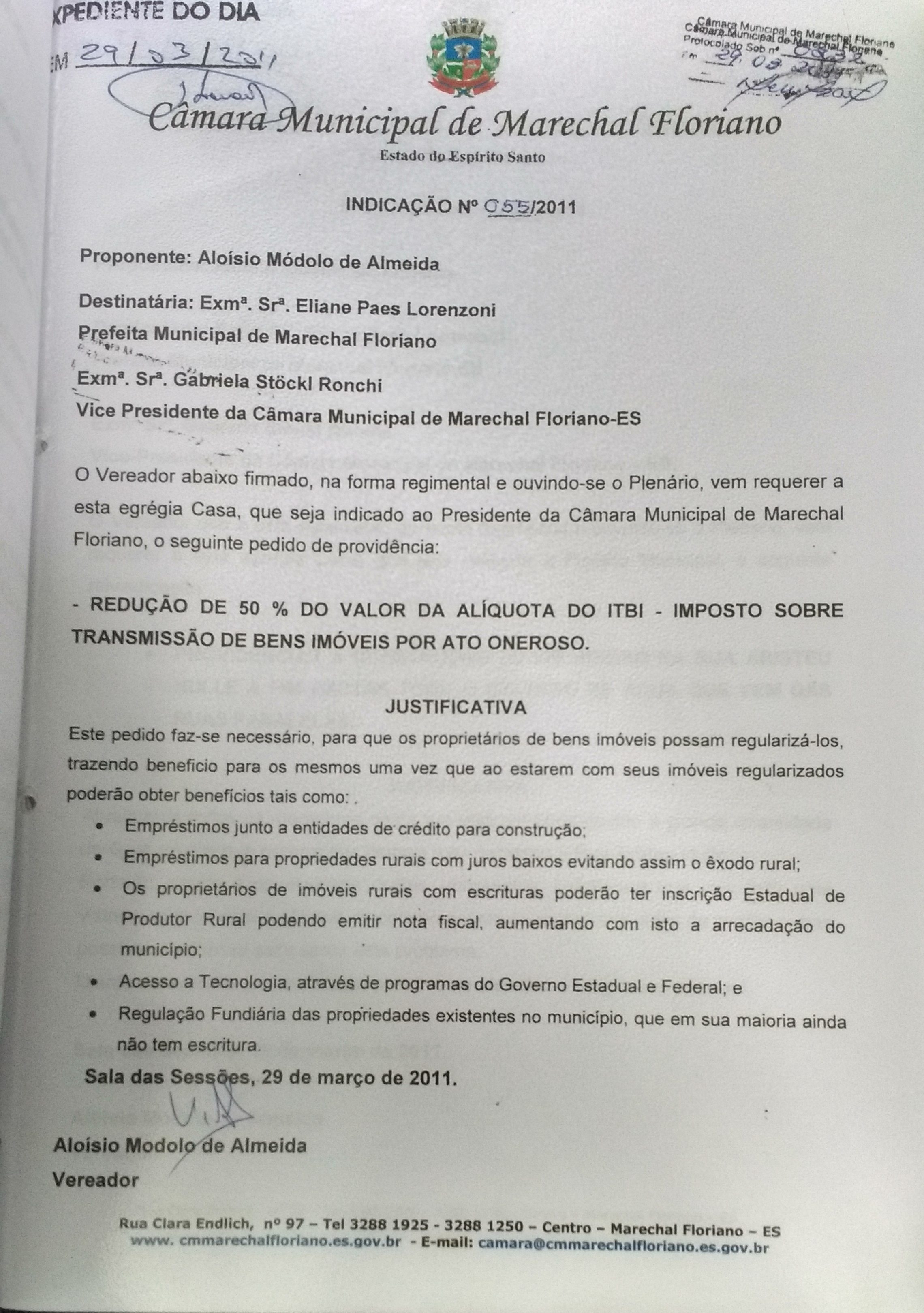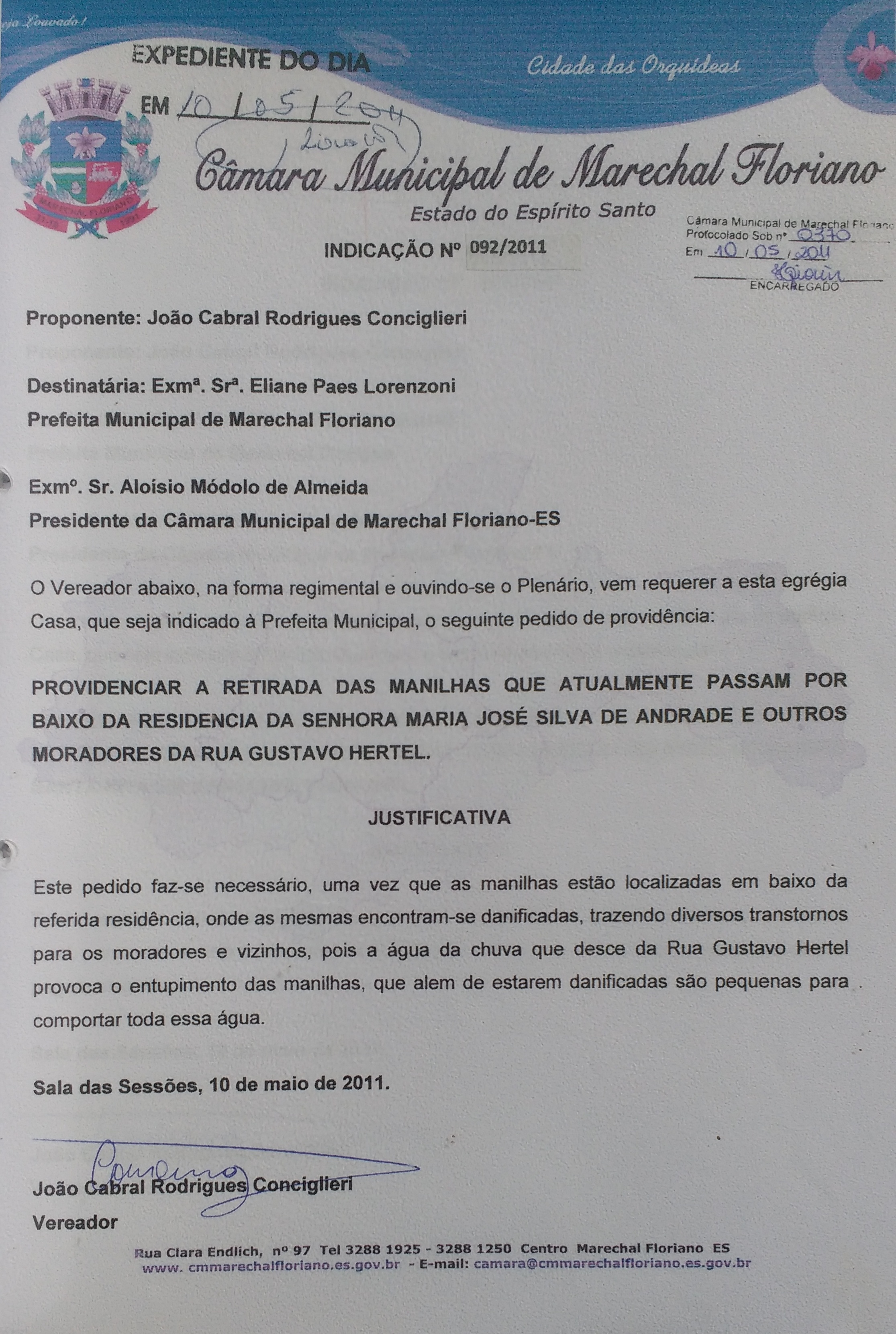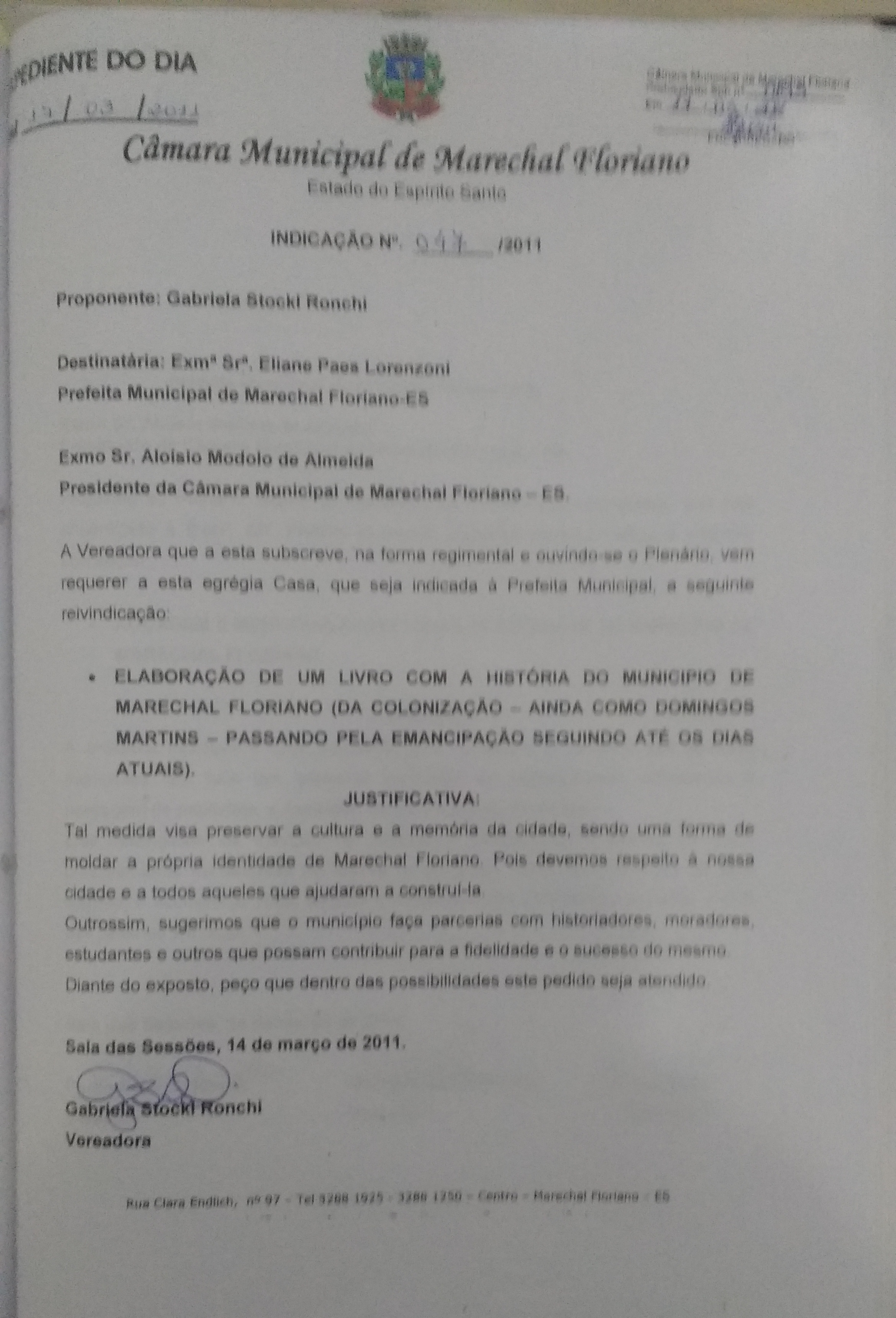 Ementa: ELABORAÇÃO DE UM LIVRO COM A HISTÓRIA DO MUNICÍPIO DE MARECHAL FLORIANO (DA COLONIZAÇÃO - AINDA COMO DOMINGOS MARTINS - PASSANDO PELA EMANCIPAÇÃO SEGUINDO ATÉ OS DIAS ATUAIS).