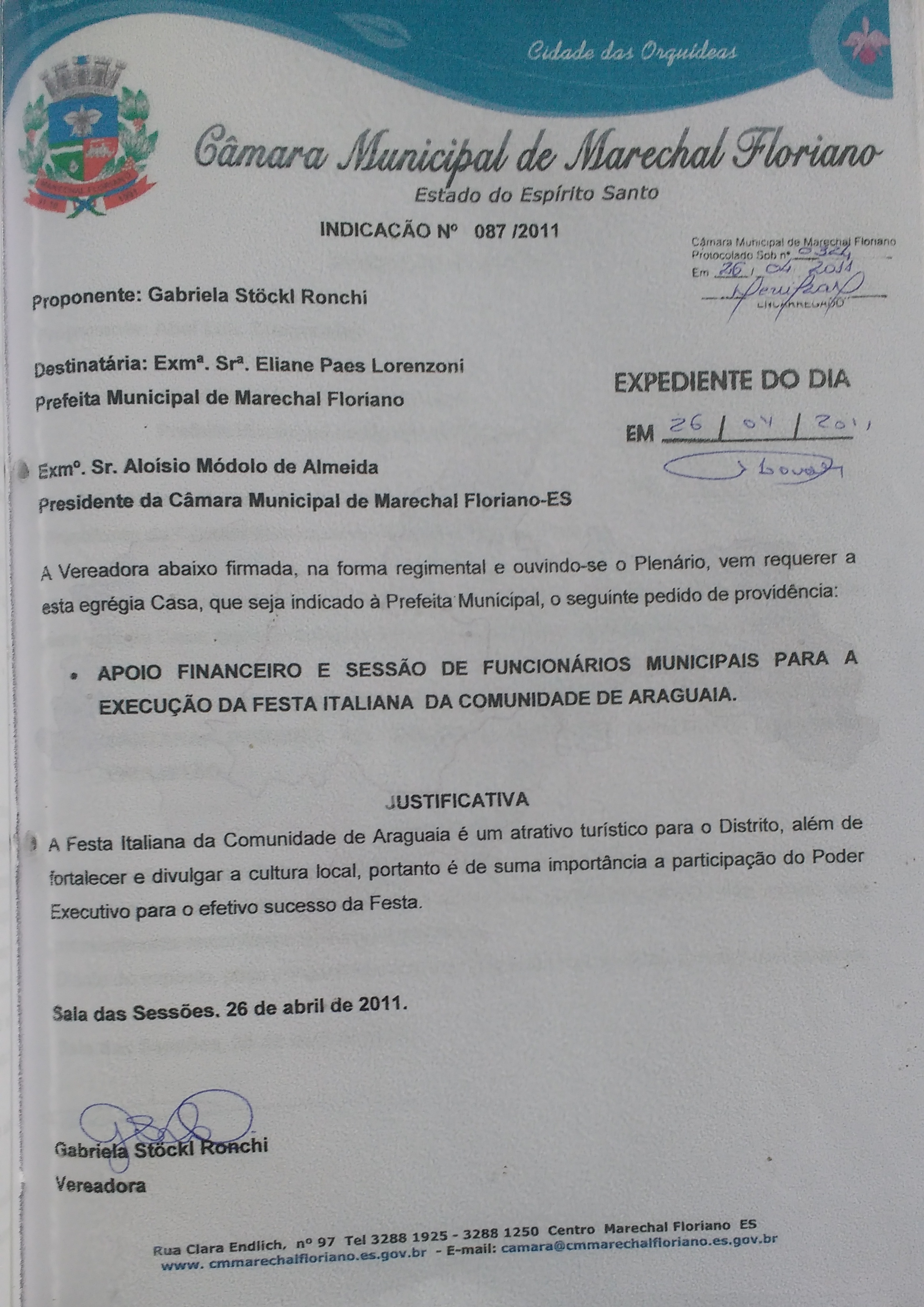 Ementa: APOIO FINANCEIRO E SESSÃO DE FUNCIONÁRIOS MUNICIPAIS PARA A EXECUÇÃO DA FESTA ITALIANA DA COMUNIDADE DE ARAGUAIA.