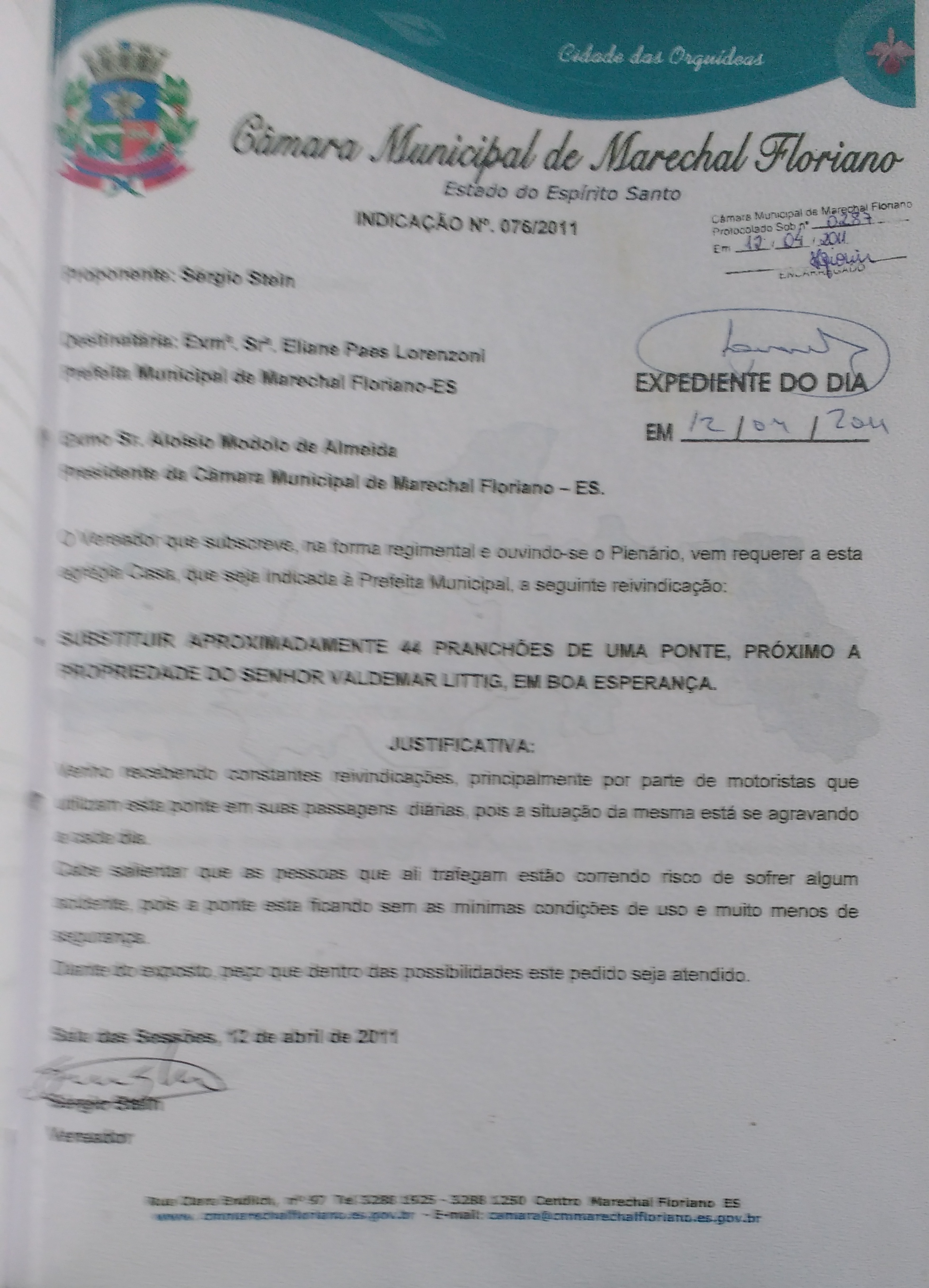 Ementa: SUBSTITUIR APROXIMADAMENTE 44 PRANCHÕES DE UMA PONTE, PRÓXIMO A PROPRIEDADE DO SENHOR VALDEMAR LITTIG, EM BOA ESPERANÇA.