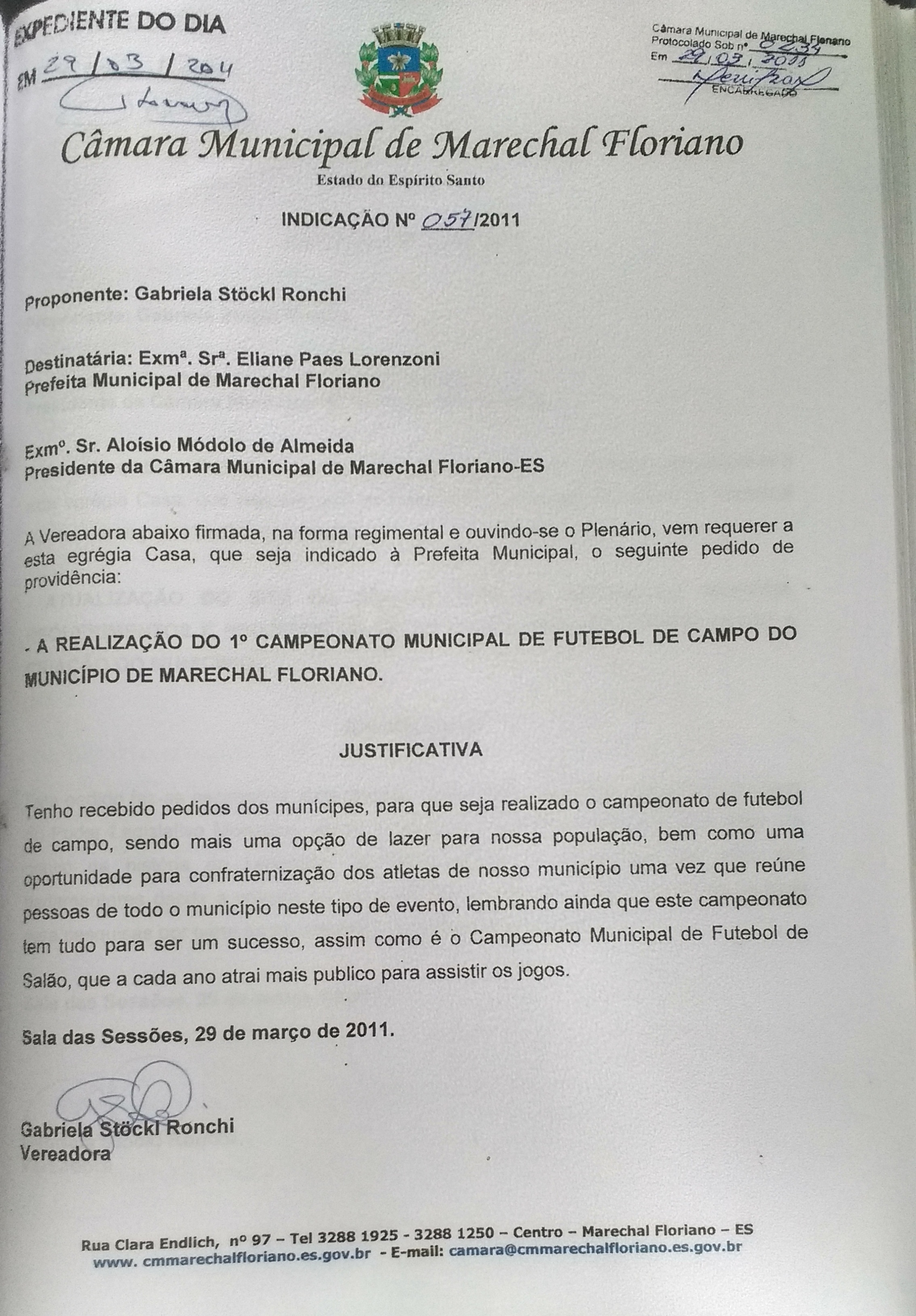 Ementa: A REALIZAÇÃO DO 1° CAMPEONATO MUNICIPAL DE FUTEBOL DE CAMPO DO MUNICÍPIO DE MARECHAL FLORIANO.