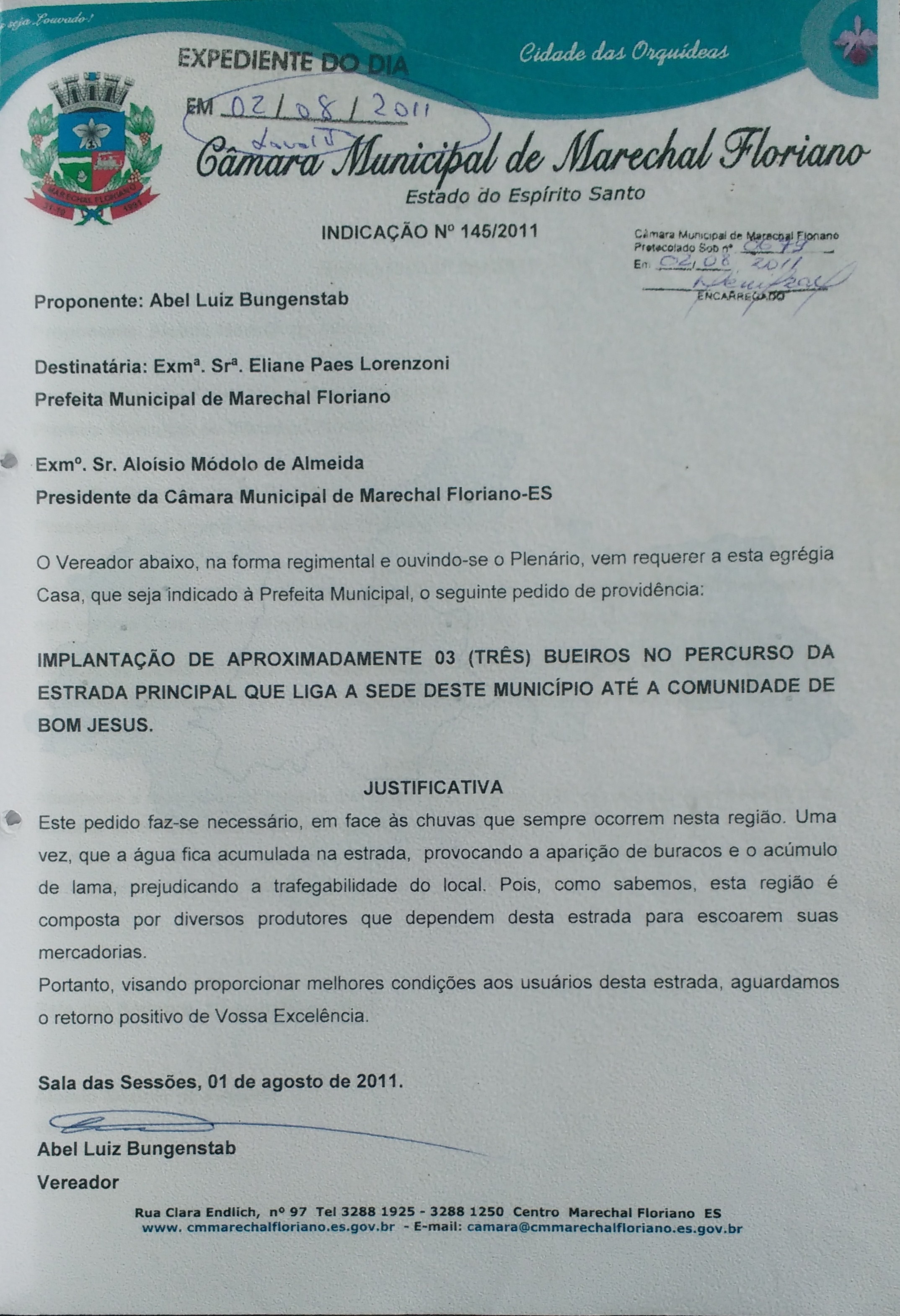 Ementa: IMPLANTAÇÃO DE APROXIMADAMENTE 03 (TRÊS) BUEIROS NO PERCURSO DA ESTRADA PRINCIPAL QUE LIGA A SEDE DESTE MUNICÍPIO ATÉ A COMUNIDADE DE BOM JESUS.