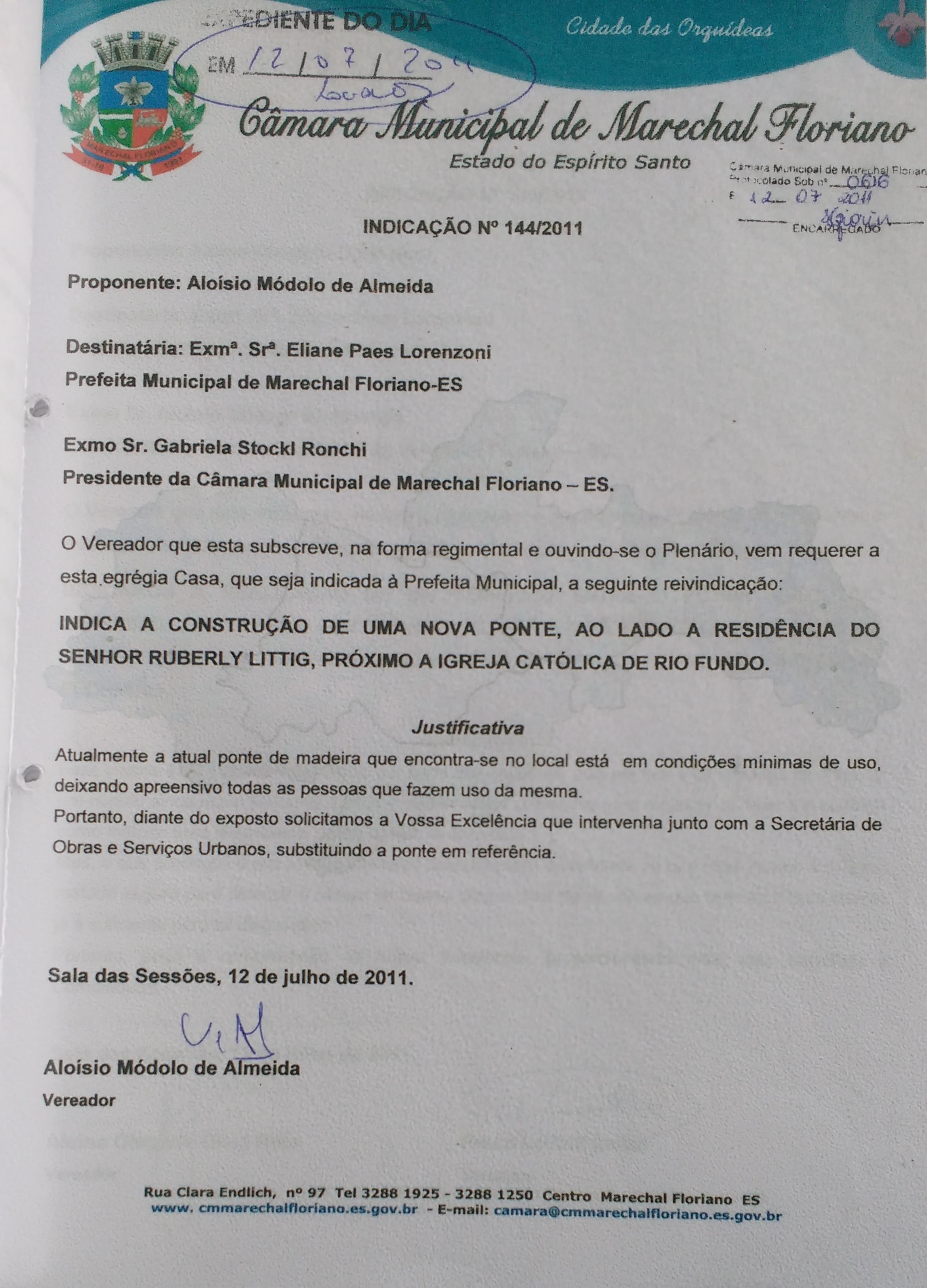 Ementa: INDICA A CONSTRUÇÃO DE UMA NOVA PONTE, AO LADO A RESIDÊNCIA DO SENHOR RUBERLY LITTIG, PRÓXIMO A IGREJA CATÓLICA DE RIO FUNDO.