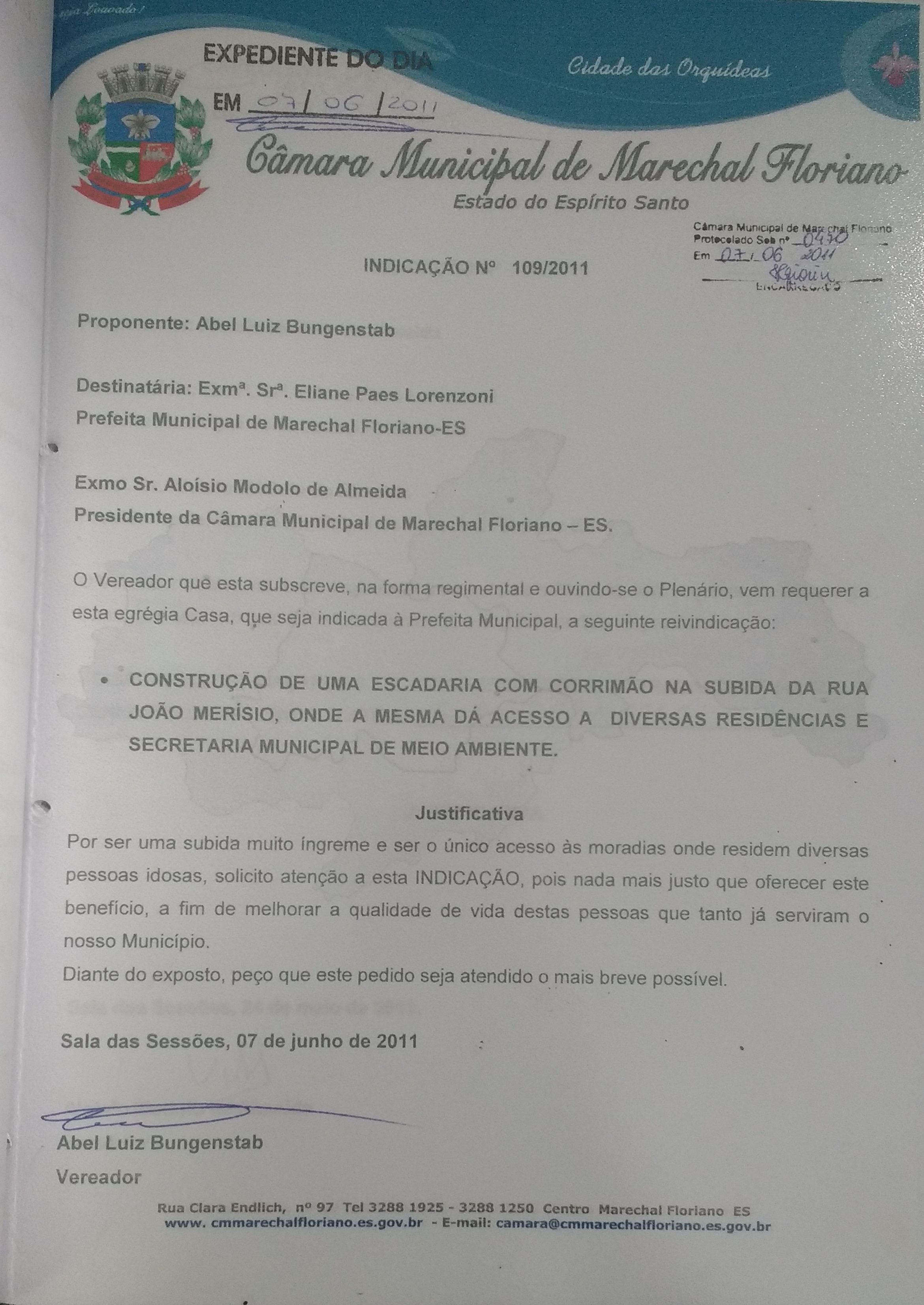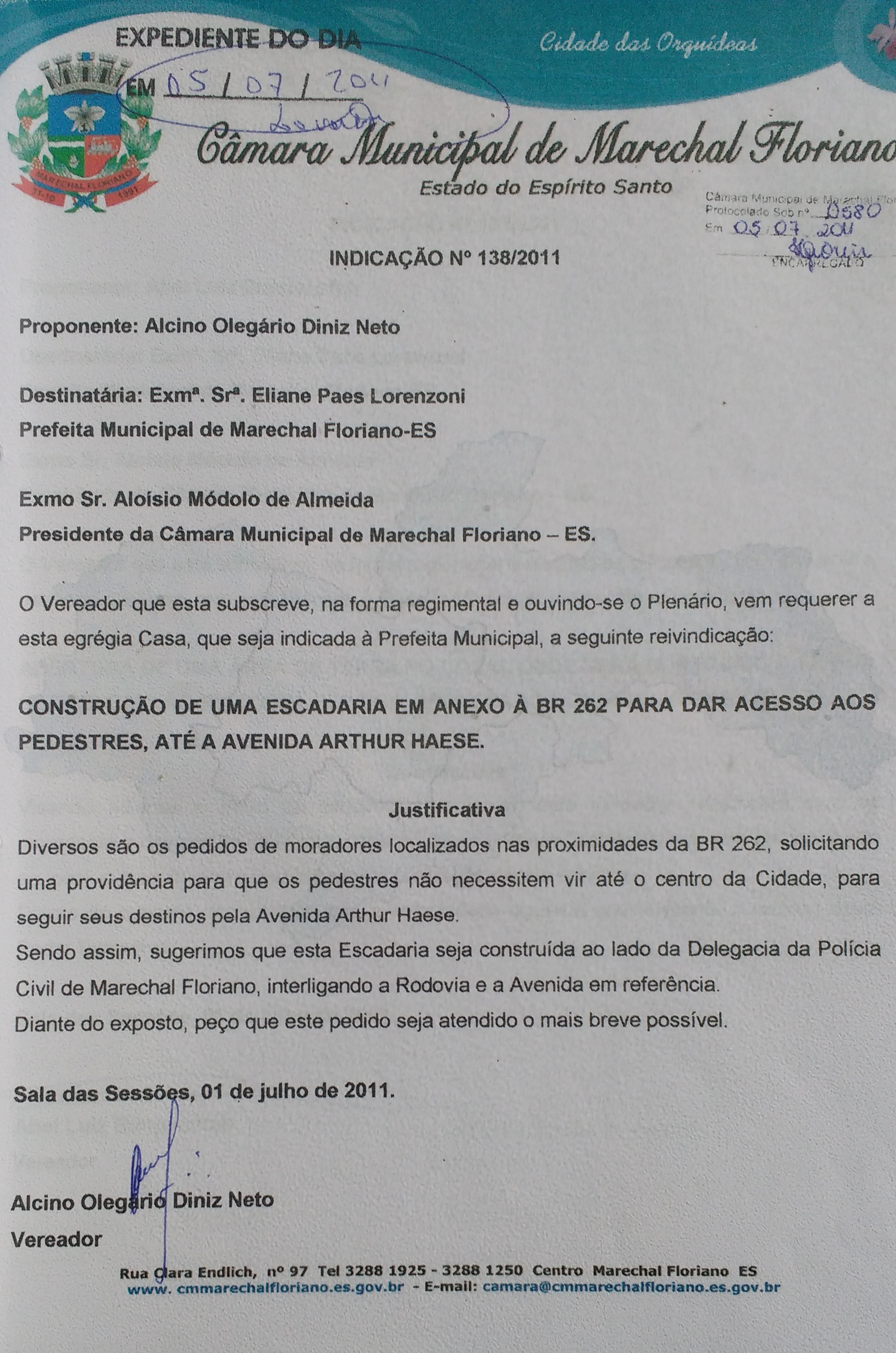 Ementa: CONSTRUÇÃO DE UMA ESCADARIA EM ANEXO À BR 262 PARA DAR ACESSO AOS PEDESTRES, ATÉ A AVENIDA ARTHUR HAESE.
