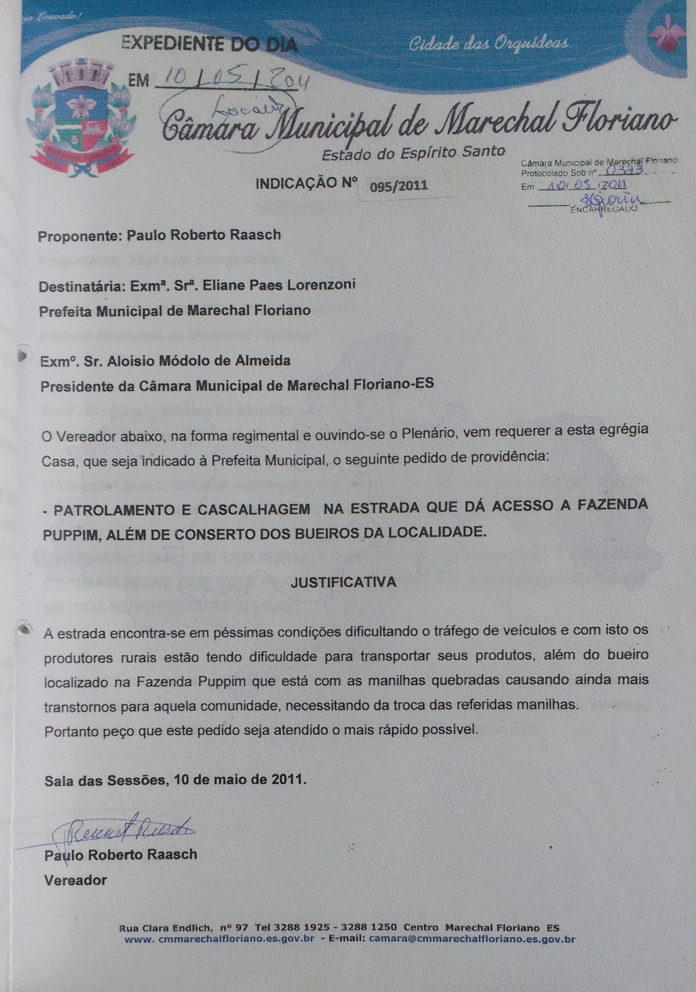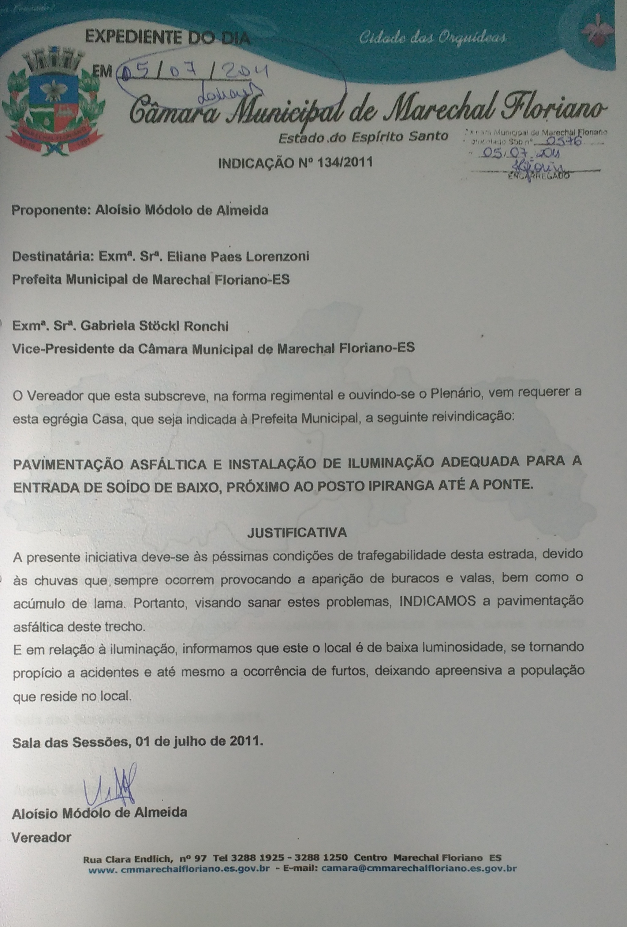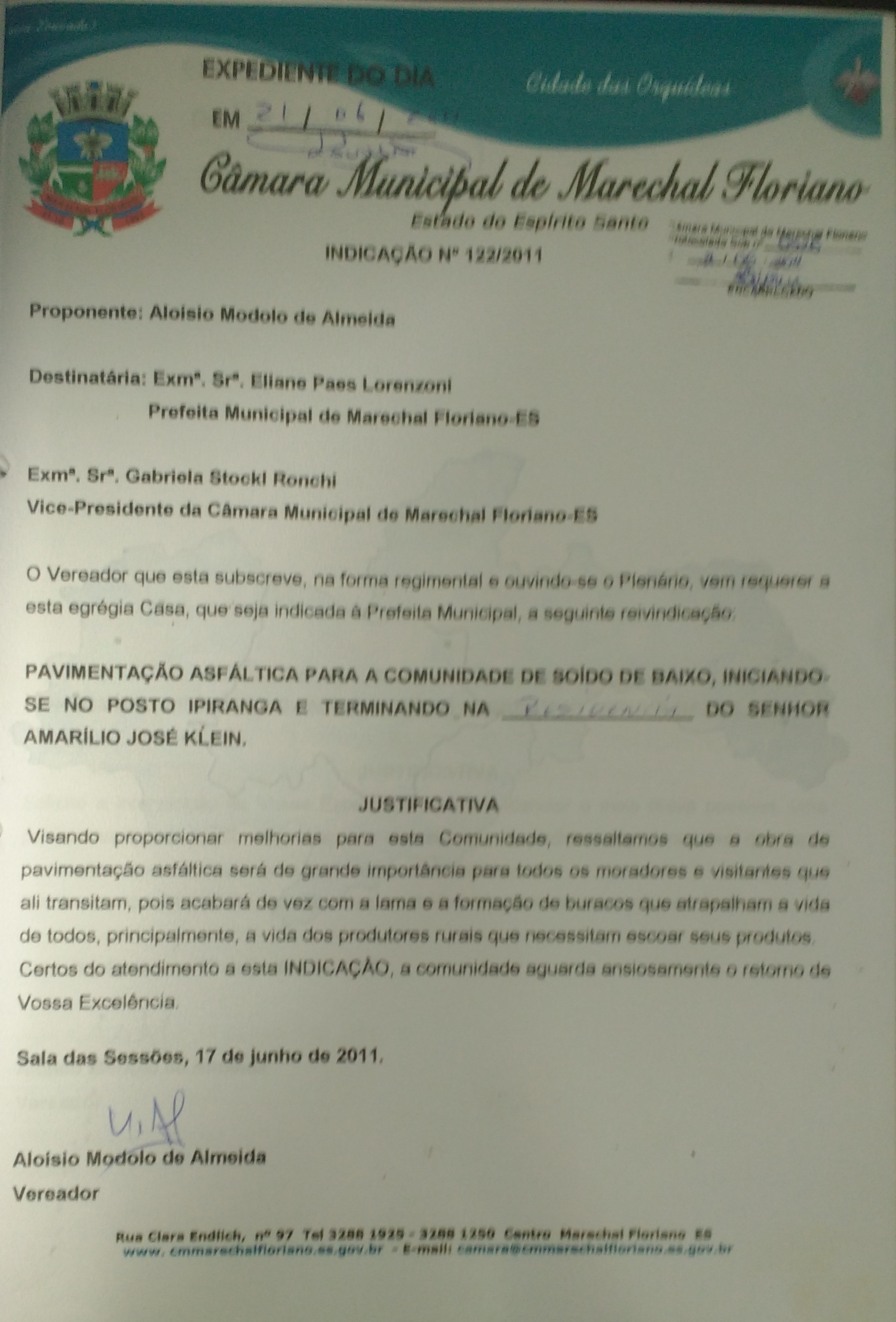 Ementa: PAVIMENTAÇÃO ASFÁLTICA PARA A COMUNIDADE DE SOÍDO DE BAIXO, INICIANDO-SE NO POSTO IPIRANGA E TERMINANDO NA RESIDENCIA DO SENHOR AMARÍLIO JOSÉ KLEIN.