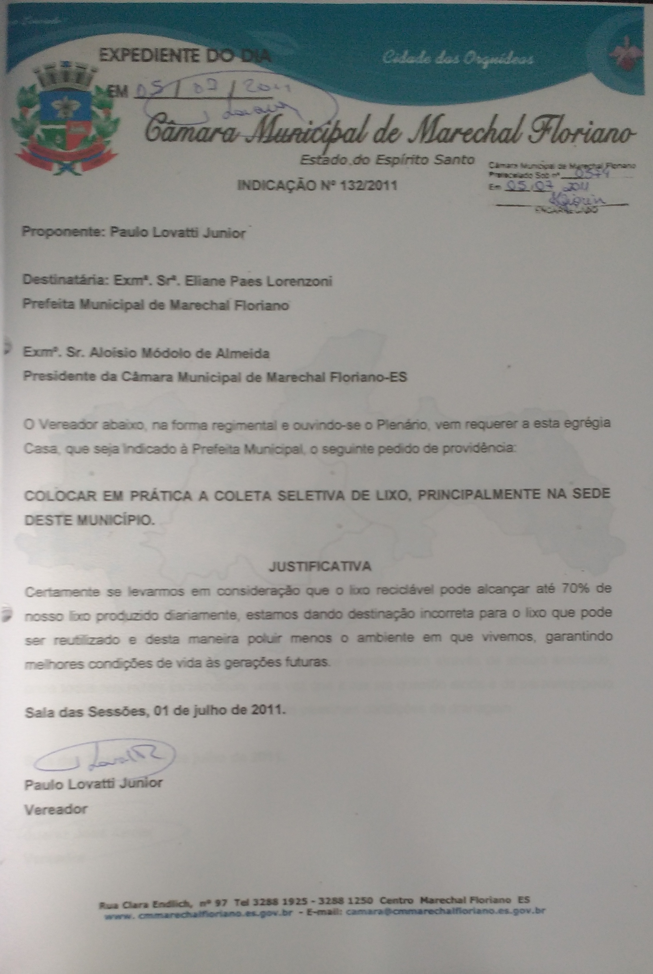Ementa: COLOCAR EM PRÁTICA A COLETA SELETIVA DE LIXO, PRINCIPALMENTE NA SEDE DESTE MUNICÍPIO.