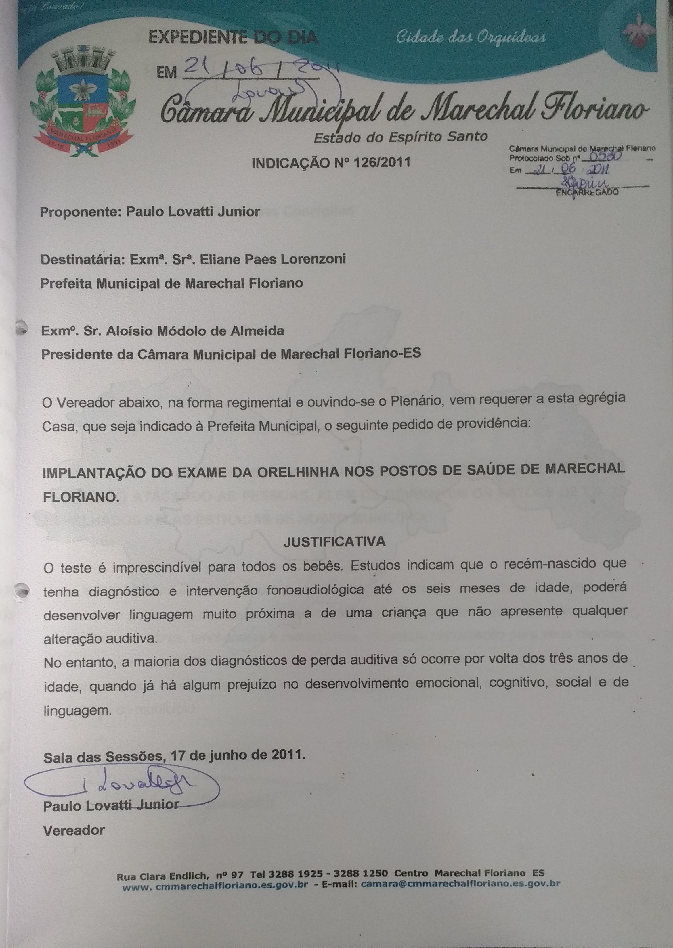 Ementa: IMPLANTAÇÃO DO EXAME DA ORELHINHA NOS POSTOS DE SAÚDE DE MARECHAL FLORIANO.