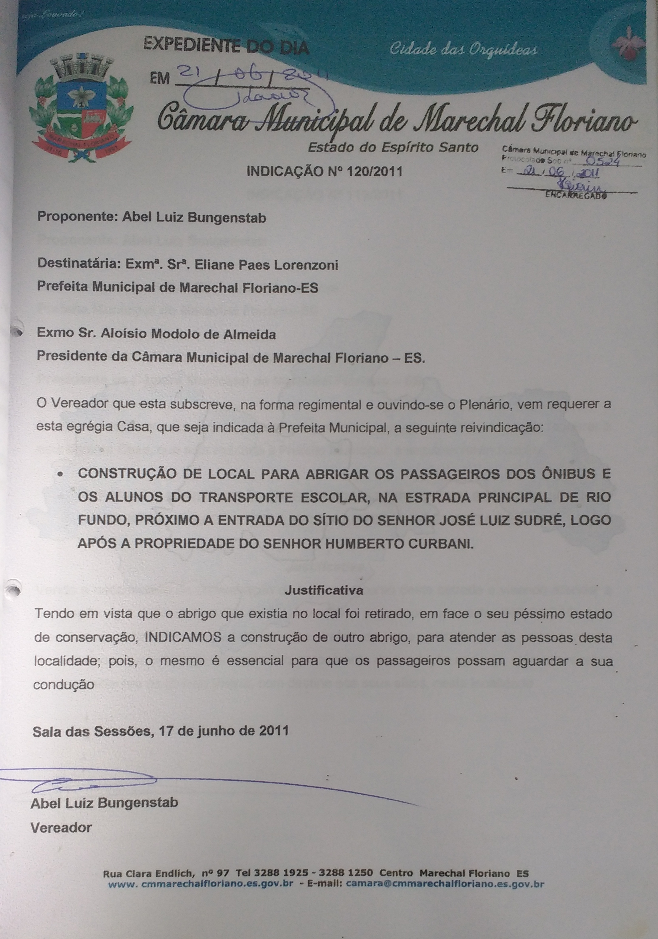 Ementa: CONSTRUÇÃO DE LOCAL PARA ABRIGAR OS PASSAGEIROS DOS ÔNIBUS E OS ALUNOS DO TRANSPORTE ESCOLAR, NA ESTRADA PRINCIPAL DE RIO FUNDO, PRÓXIMO A ENTRADA DO SITIO DO SENHOR JOSÉ LUIZ SUDRÉ, LOGO APÓS A PROPRIEDADE DO SENHOR HUMBERTO CURBANI.