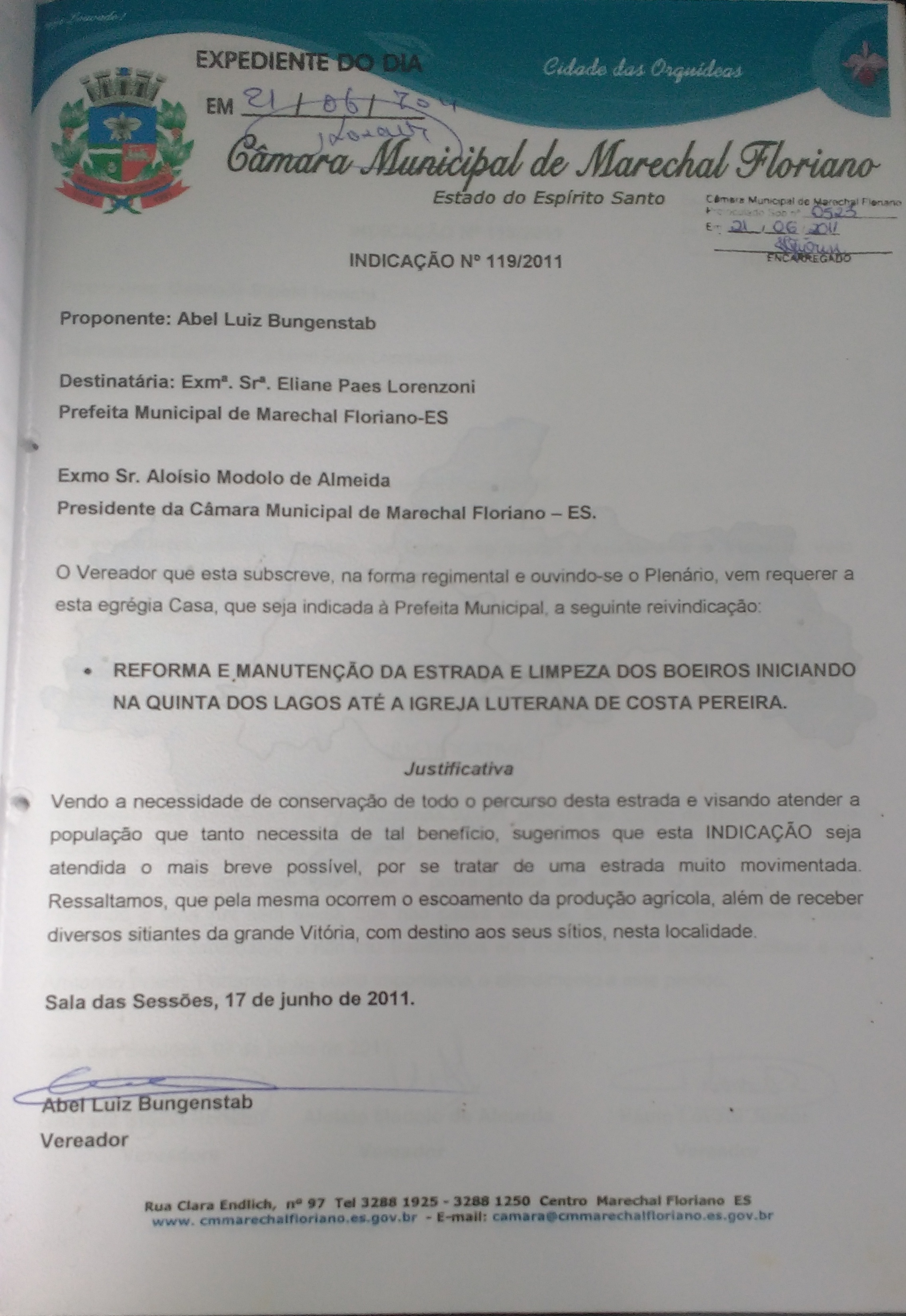 Ementa: REFORMA E MANUTENÇÃO DA ESTRADA E LIMPEZA DOS BOEIROS INICIANDO NA QUINTA DOS LAGOS ATÉ A IGREJA LUTERANA DE COSTA PEREIRA.
