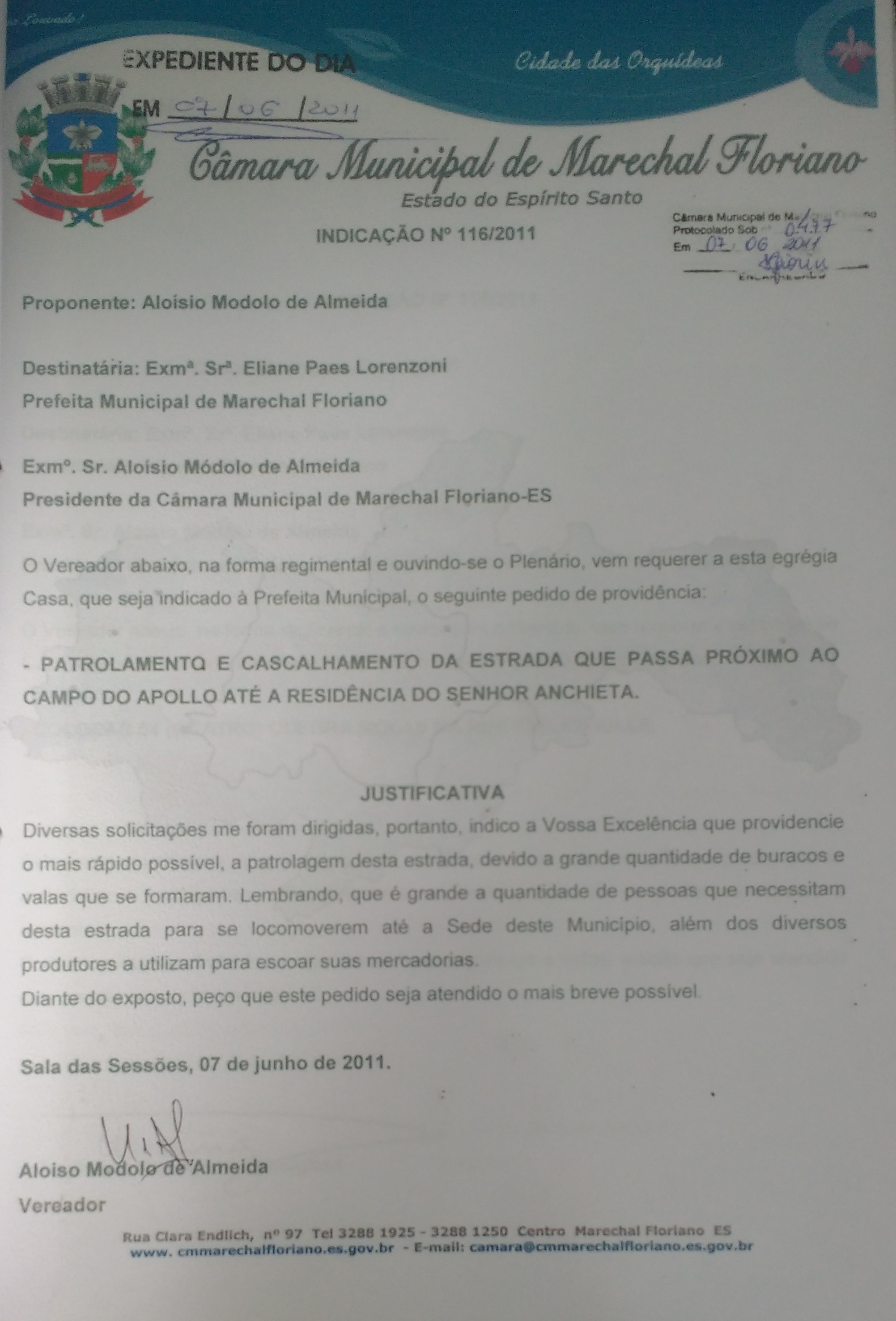 Ementa: PATROLAMENTO E CASCALHAMENTO DA ESTRADA QUE PASSA PRÓXIMO AO CAMPO DO APOLLO ATÉ A RESIDENCIA DO SENHOR ANCHIETA.